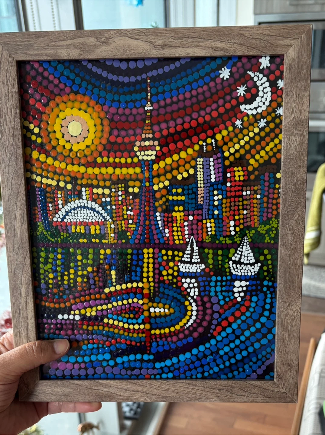 This is an original piece created by me using a dot painting style, with bright colors and a bold city skyline design inspired by the artwork shown here. It’s framed and ready to display, making it a nice piece for a living room, bedroom, office, or as a gift.