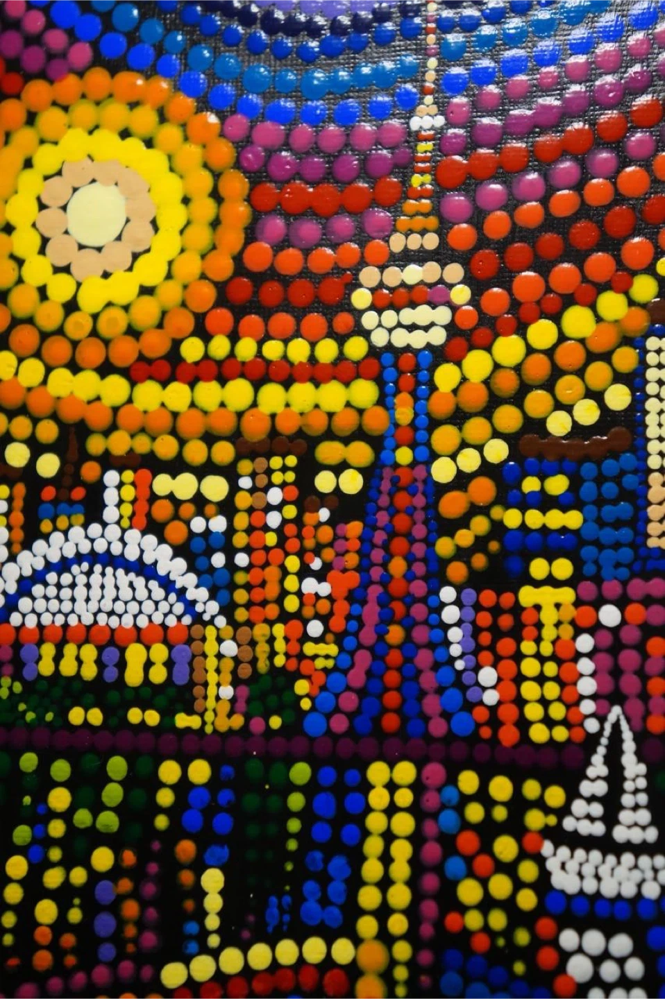 This is an original piece created by me using a dot painting style, with bright colors and a bold city skyline design inspired by the artwork shown here. It’s framed and ready to display, making it a nice piece for a living room, bedroom, office, or as a gift.