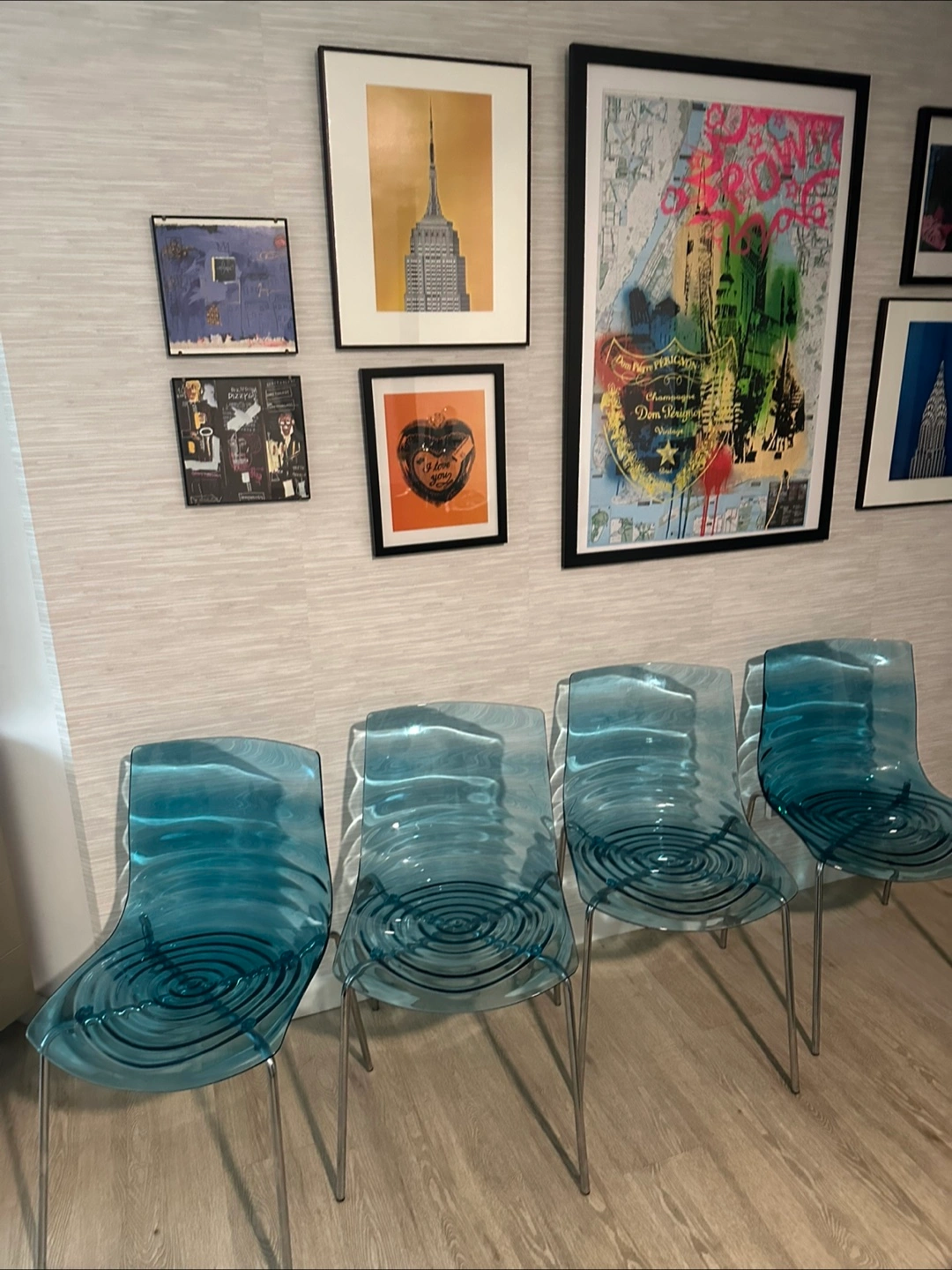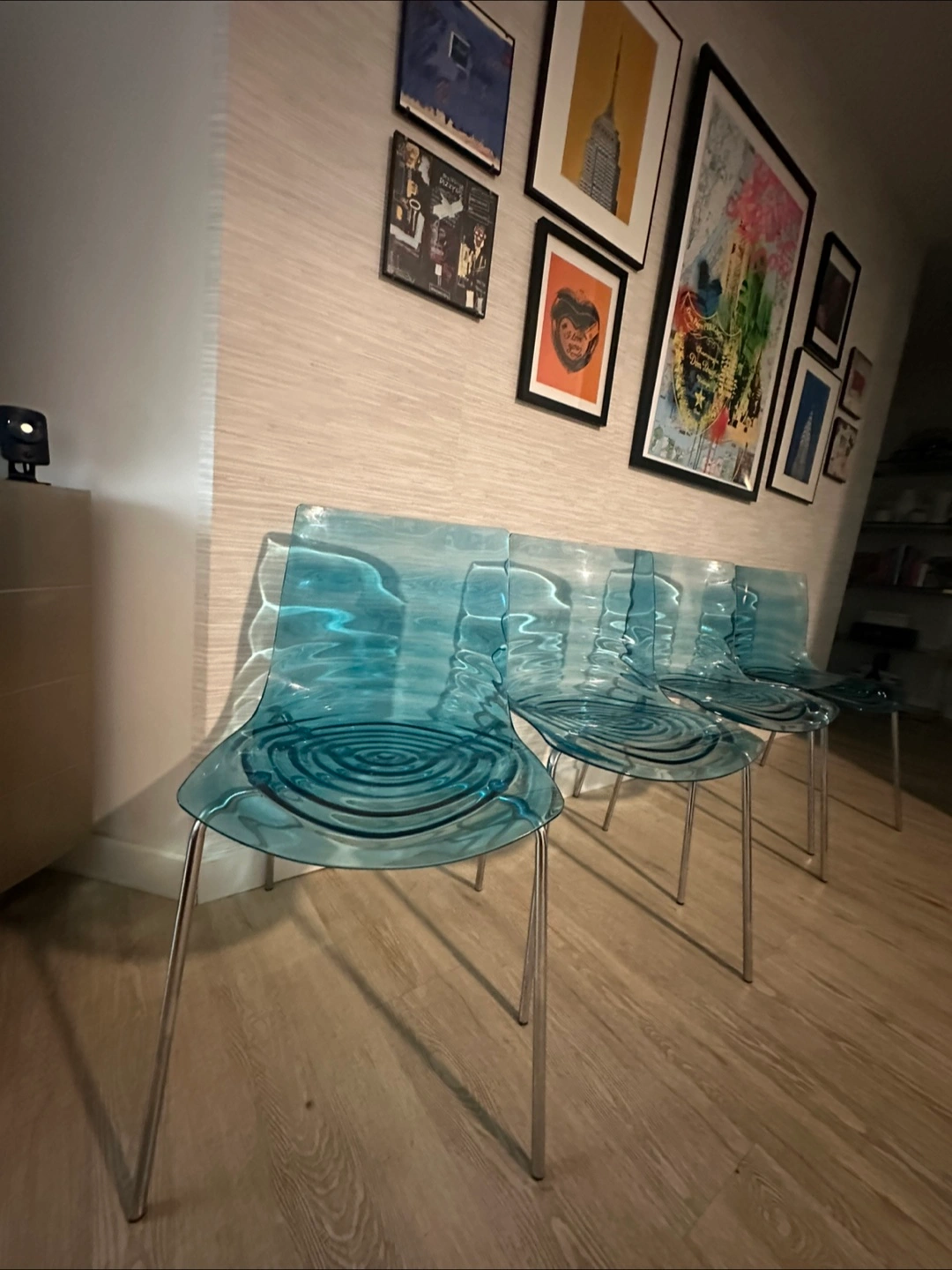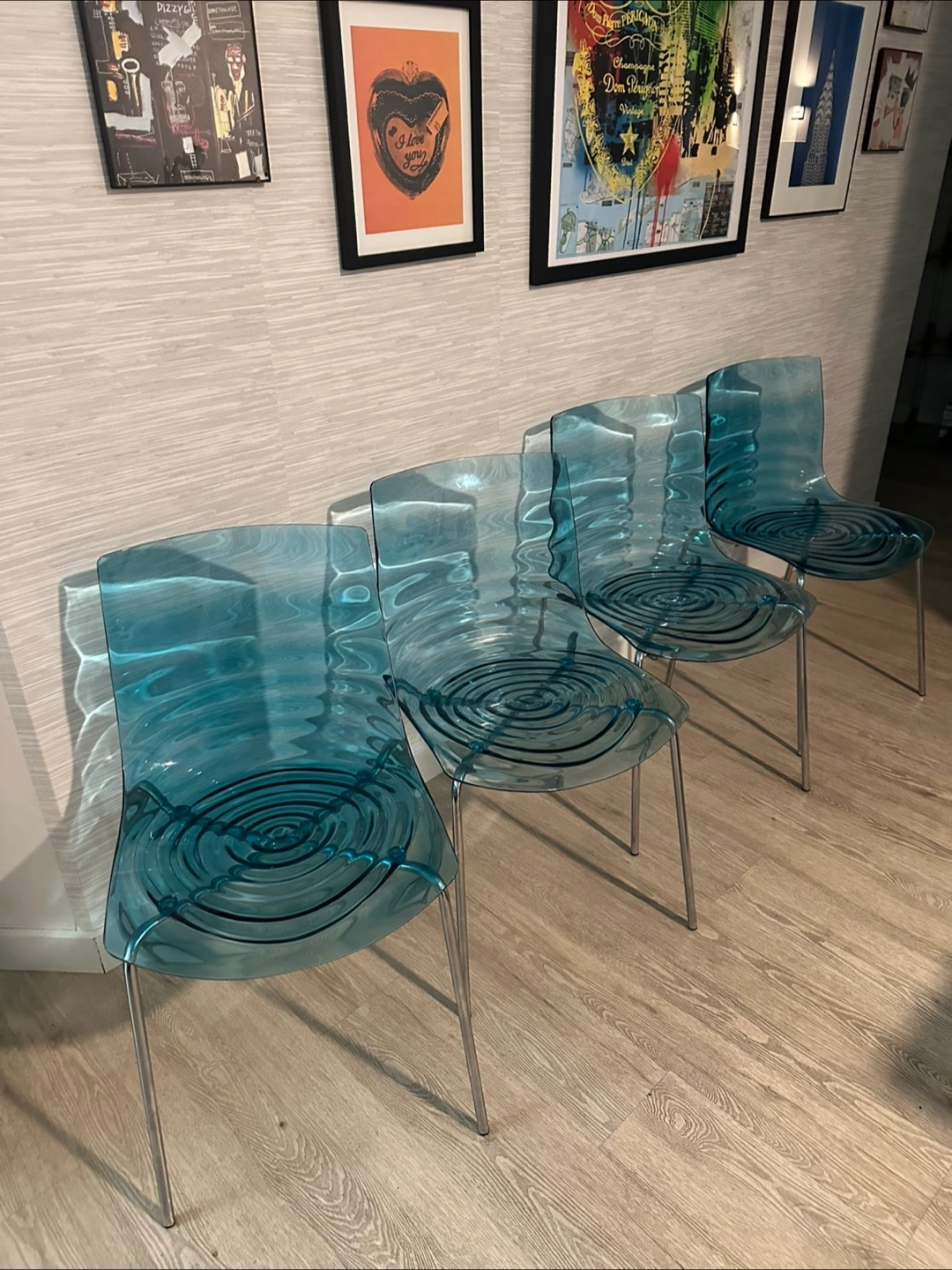 Selling a set of four Kartell like dining chairs in a beautiful blue color! These chairs are a stylish addition to any dining or living space. They are in great condition and ready for a new home. Perfect for adding a modern touch to your decor!