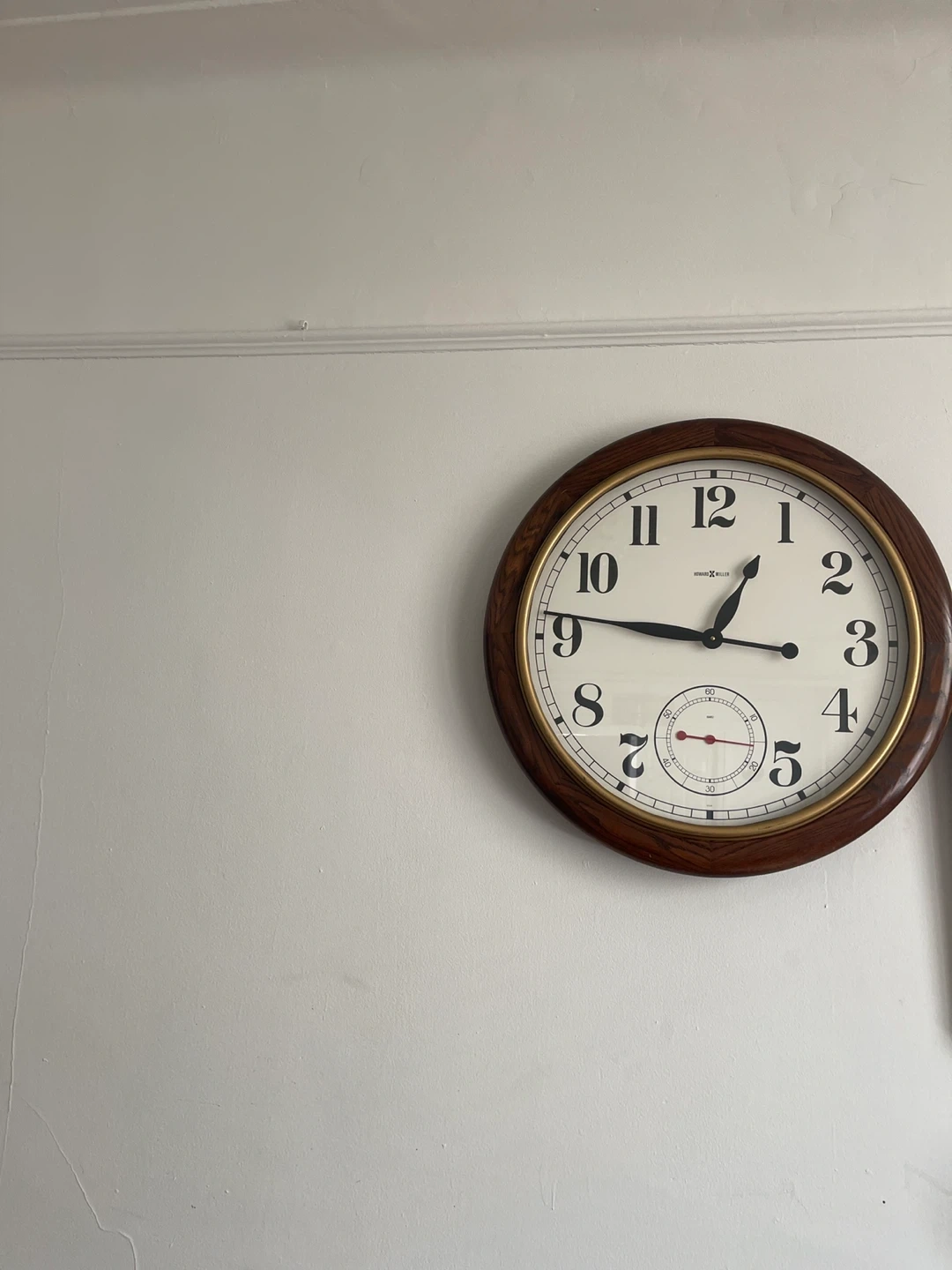 Howard Miller wall clock with a wooden frame and a white face. It features large black numerals and a smaller dial for seconds. This clock has a classic design.