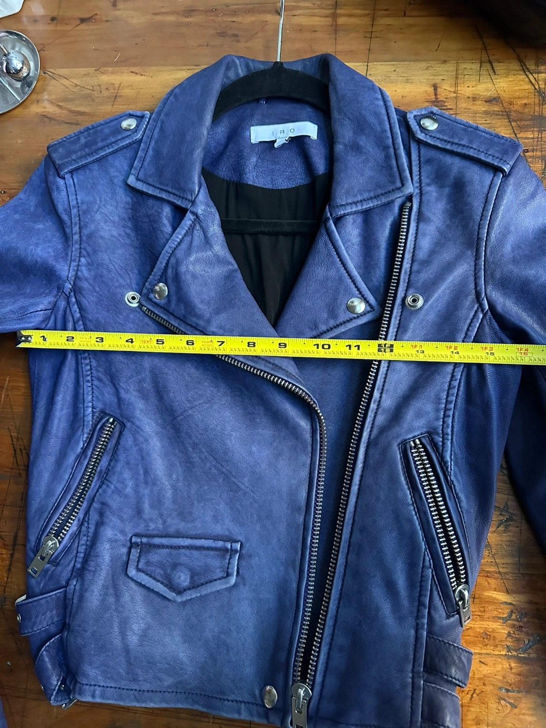 The IRO Ashville Blue Lambskin Distressed Leather Moto Jacket is a stylish and edgy women's jacket in size 2. Made from high-quality leather, this motorcycle jacket features a distressed blue color that adds a bold statement to any outfit. With a brand known for its sleek designs, this jacket is perfect for those who want to make a statement with their fashion choices. The size and fit are tailored for a regular size 2, making it a versatile and fashionable addition to any wardrobe.