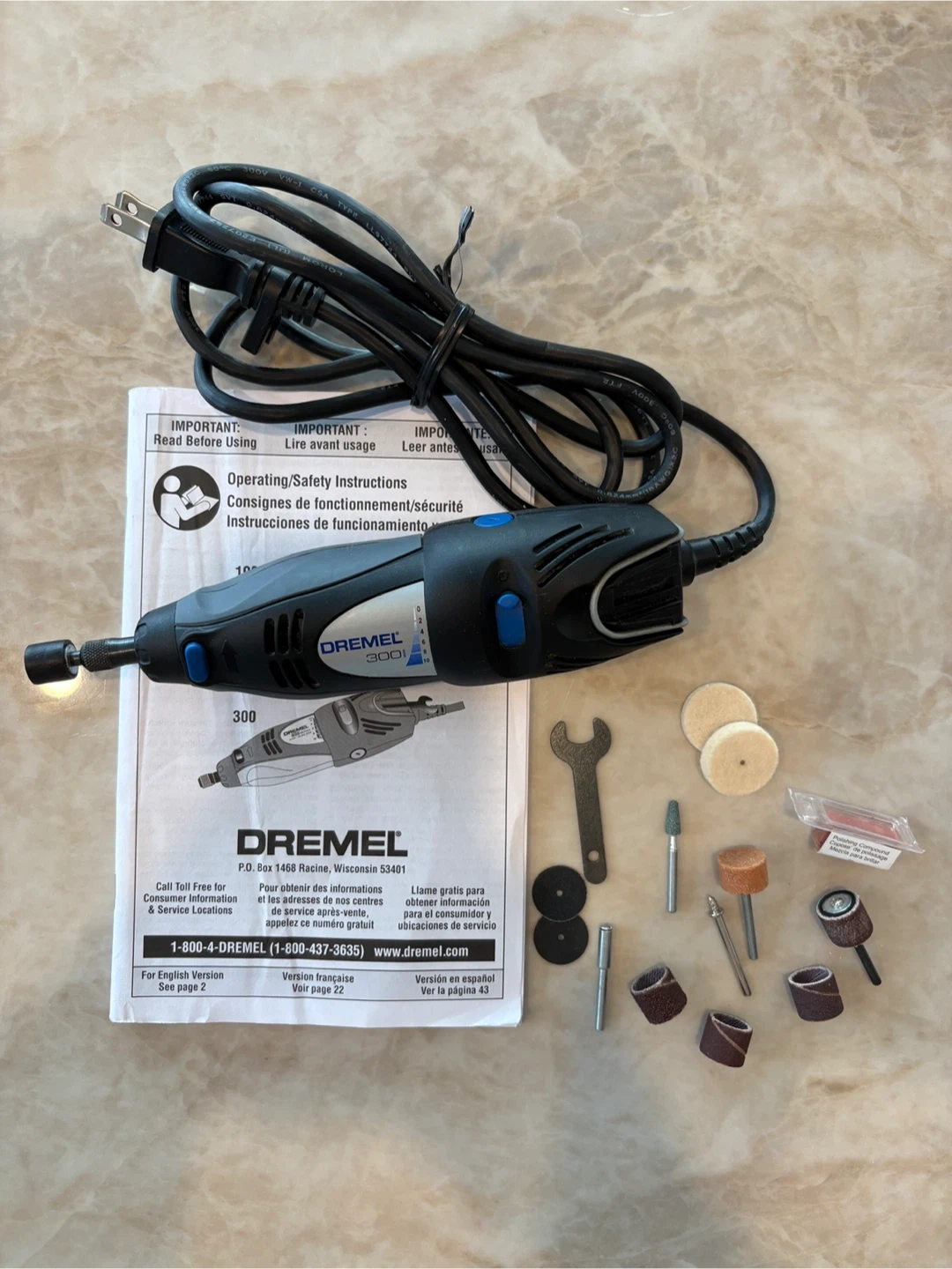 NEVER USED Dremel 3001 rotary tool kit with various sanding and polishing attachments, cutting discs, and a wrench. Includes operating and safety instructions.