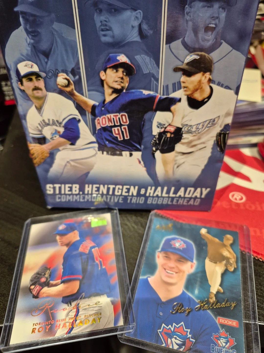Selling a commemorative bobblehead trio featuring Stieb, Hentgen, and Halladay. Also includes Roy Halladay rookie cards