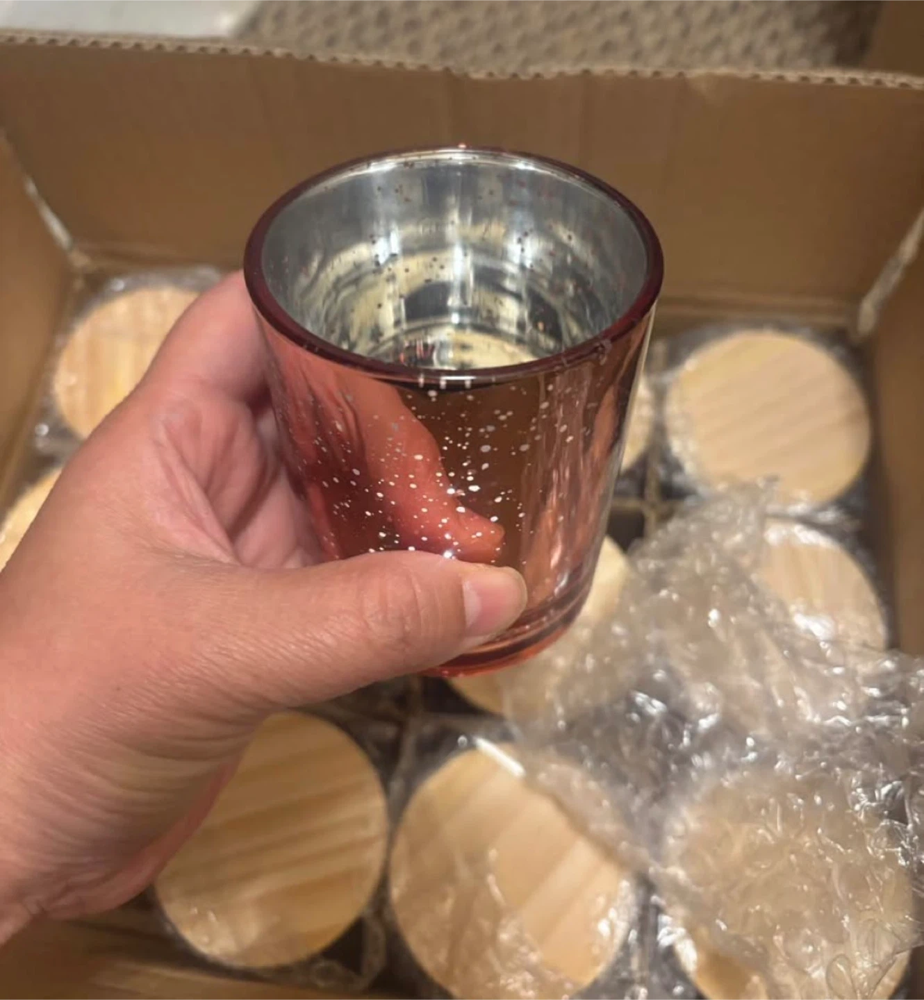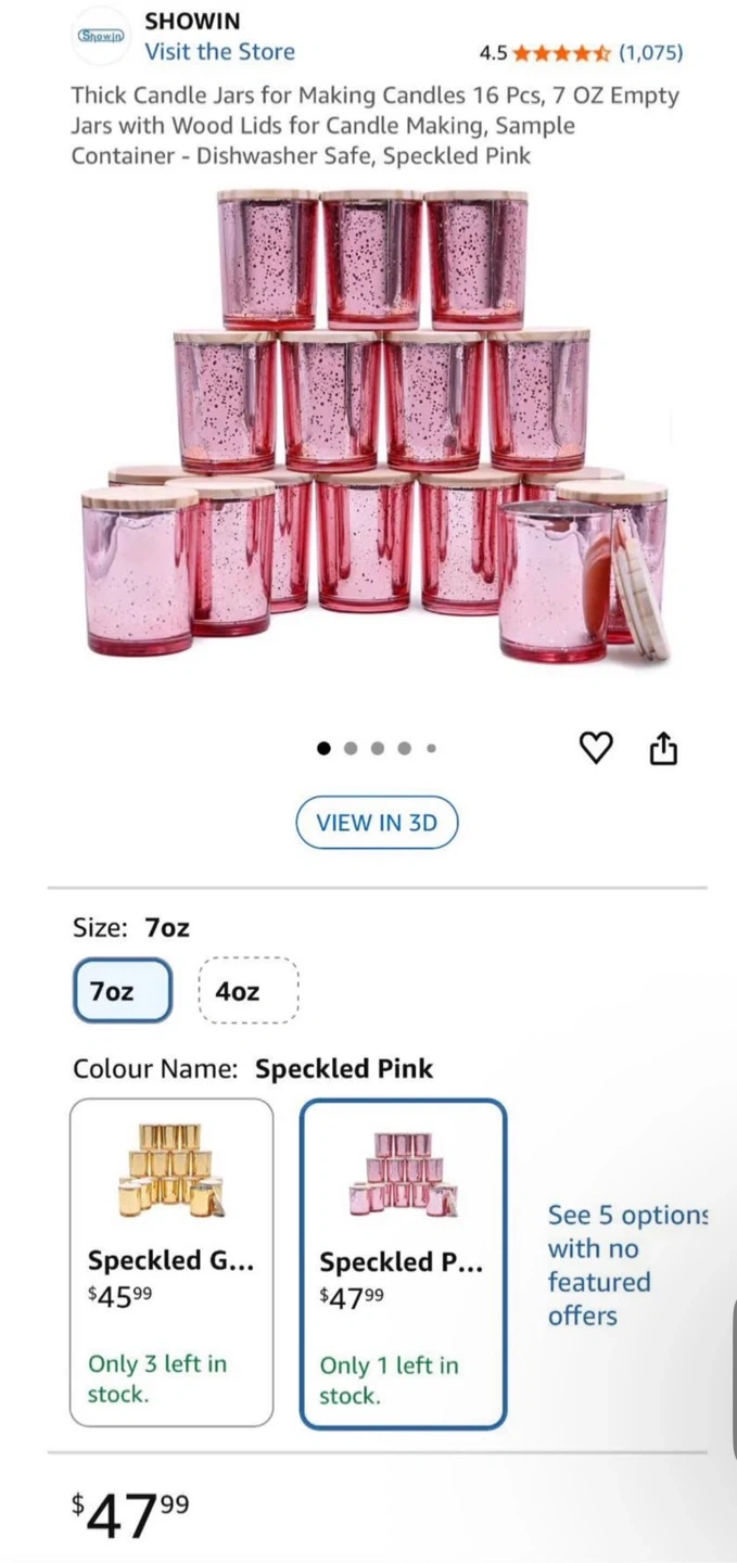 These are 12 glass jars with wood lids, perfect for making candles or storing small items. They're 7 oz each and have a speckled pink finish. Dishwasher safe.