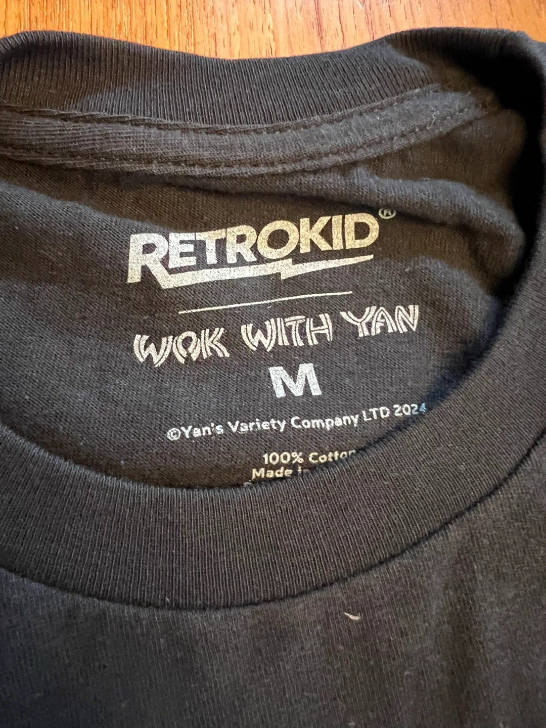 Black t-shirt featuring Stephen Yan from Wok with Yan. Made with 100% cotton. Size medium.