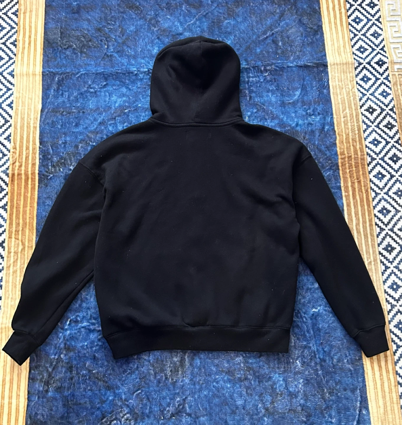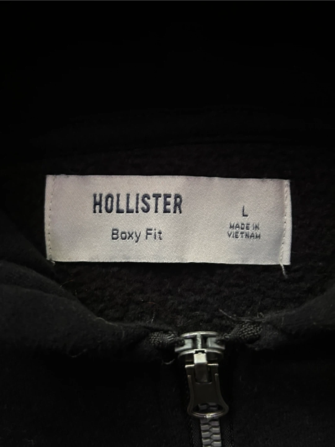 This is a black Hollister zip-up hoodie. It's a size Large with a boxy fit. Made in Vietnam.