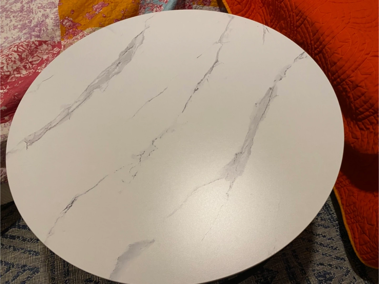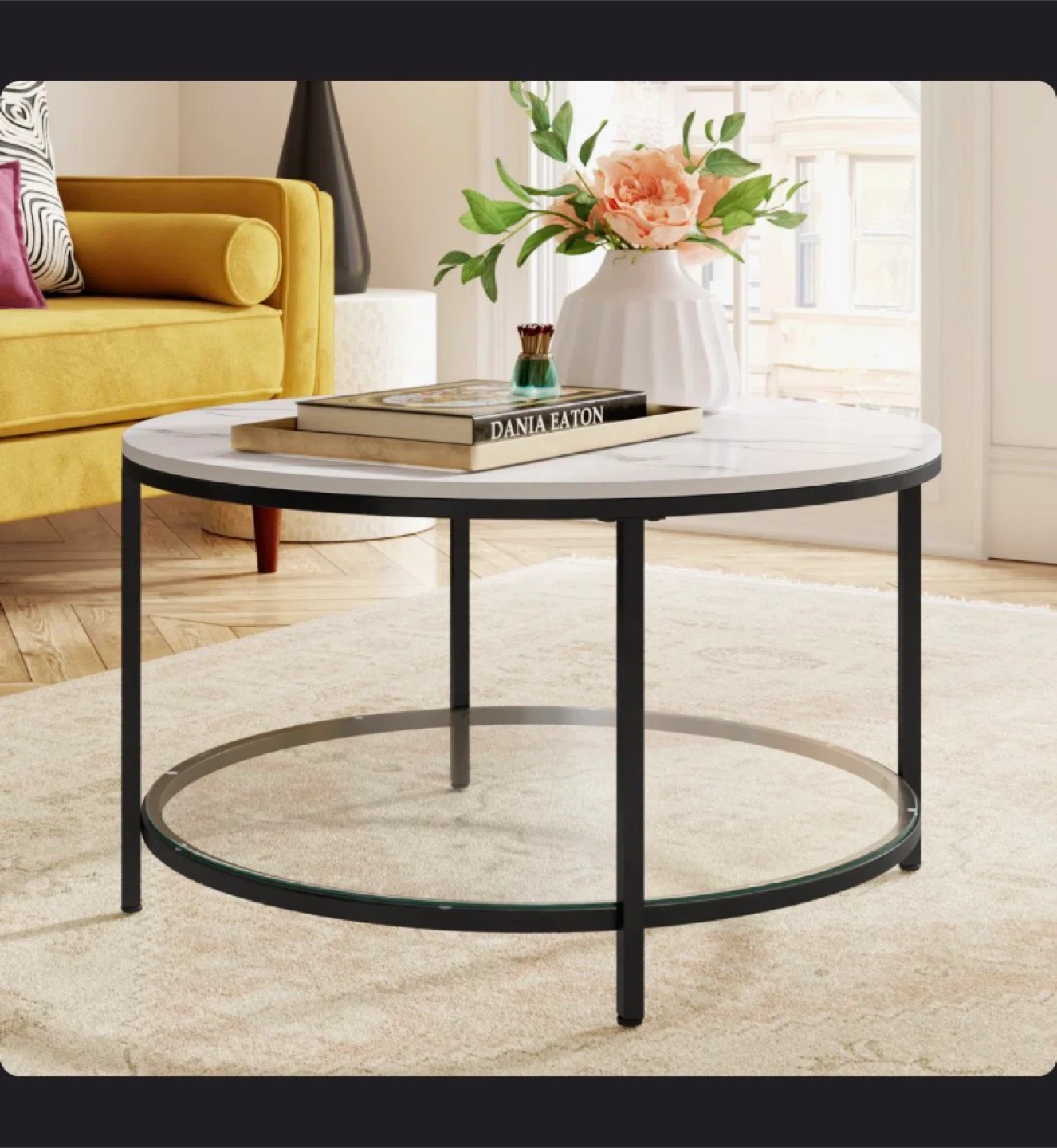 This round coffee table features a white marble-look top with a black metal frame. It's 31.5" in diameter and 17.9" high. It has a lower shelf for extra storage. Brand new used for staging purposes. Clean and smoke free Pick up Morinville or St Albert