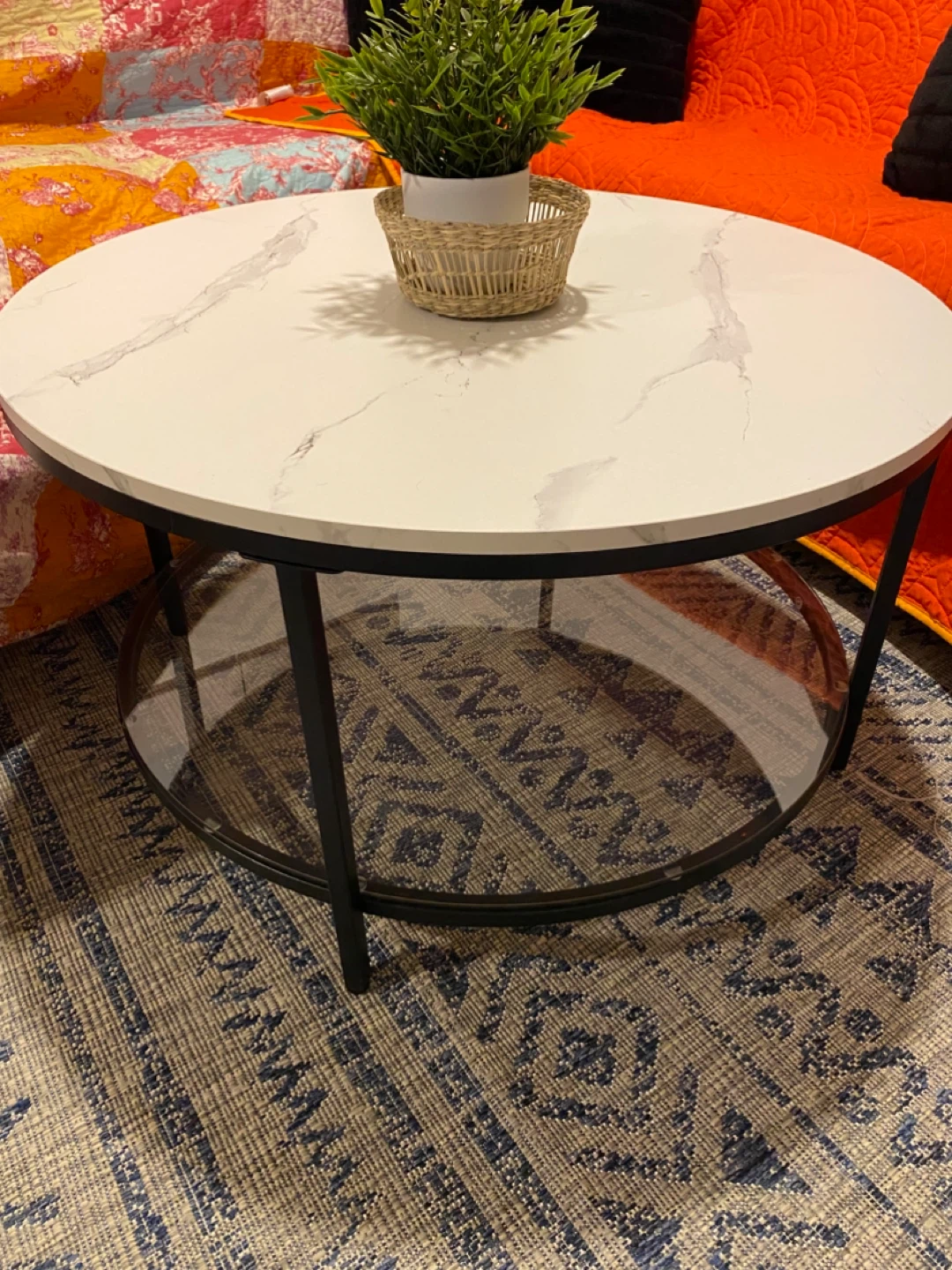 This round coffee table features a white marble-look top with a black metal frame. It's 31.5" in diameter and 17.9" high. It has a lower shelf for extra storage. Brand new used for staging purposes. Clean and smoke free Pick up Morinville or St Albert