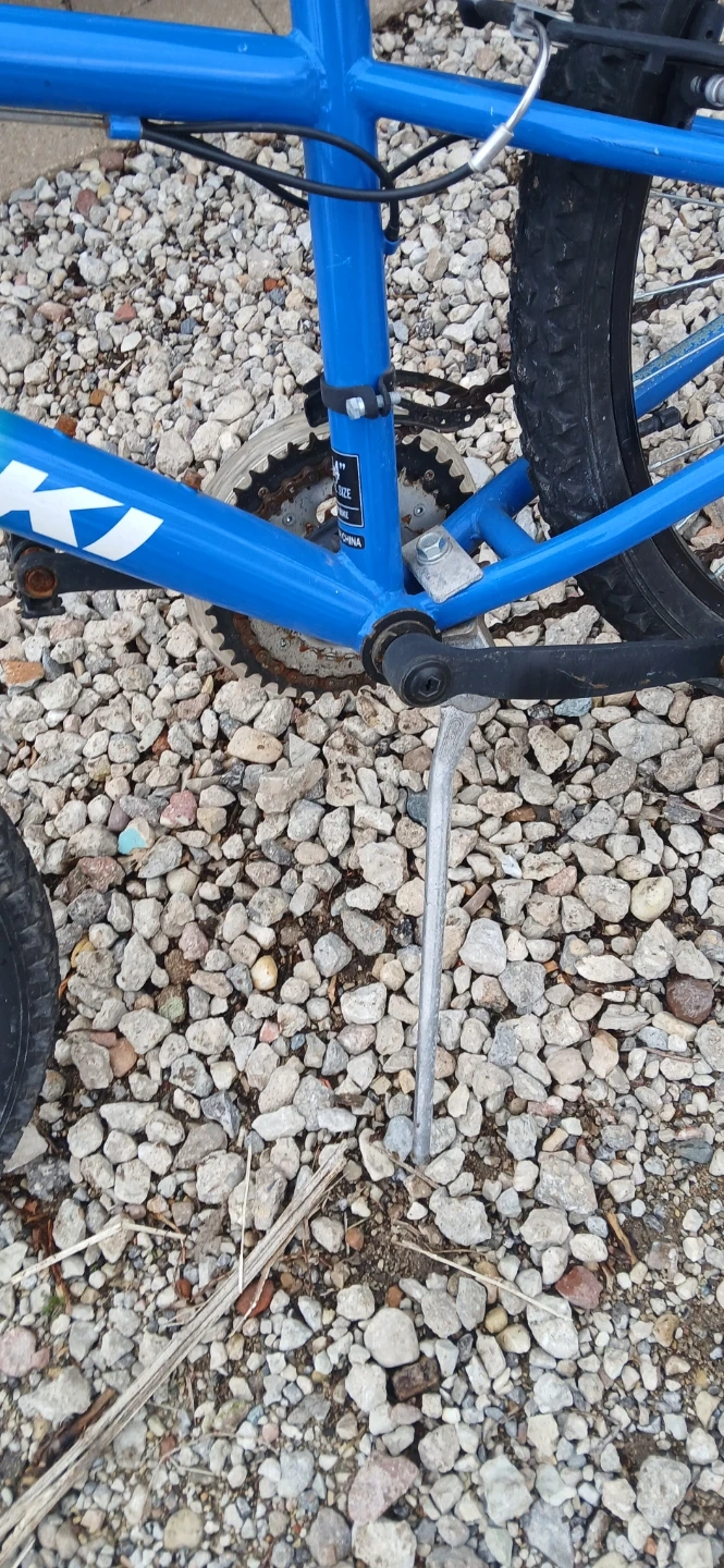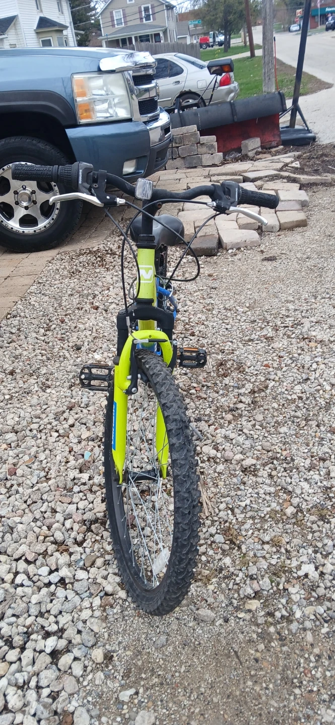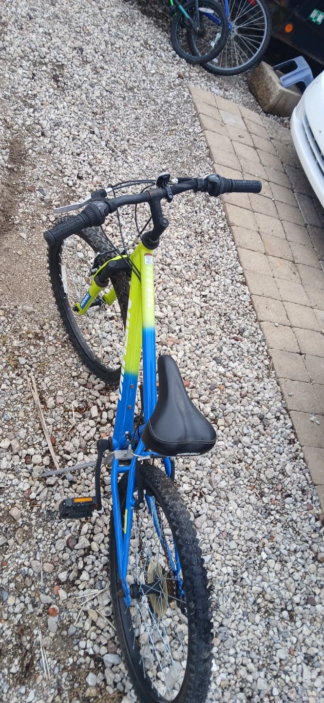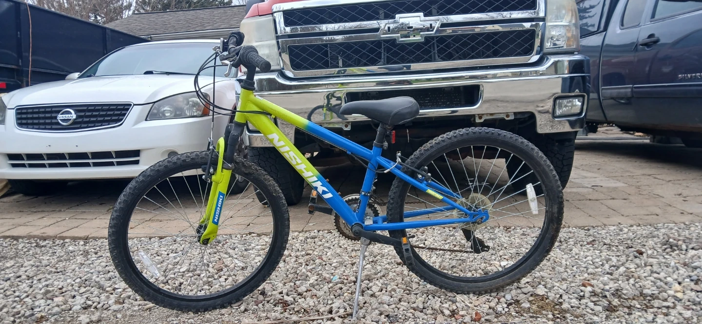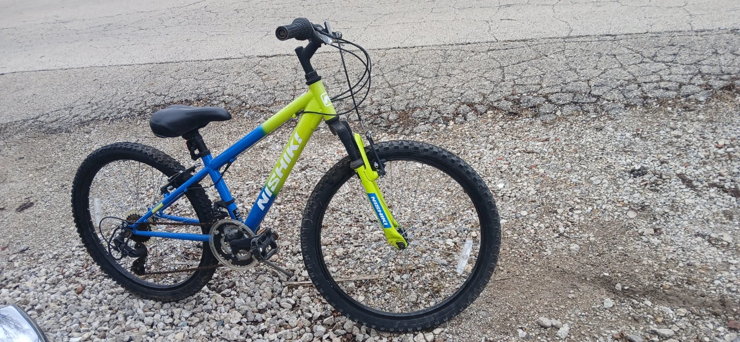 This Nishiki youth mountain bike has a 24" wheel size. It features a blue and lime green frame. It's a great bike for outdoor adventures!