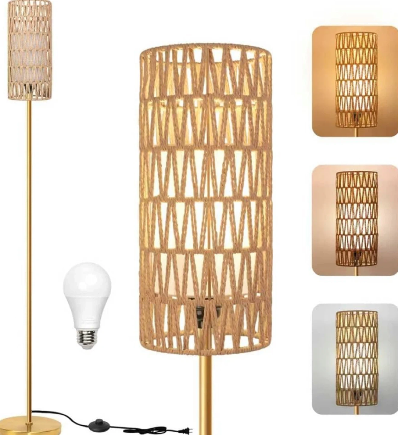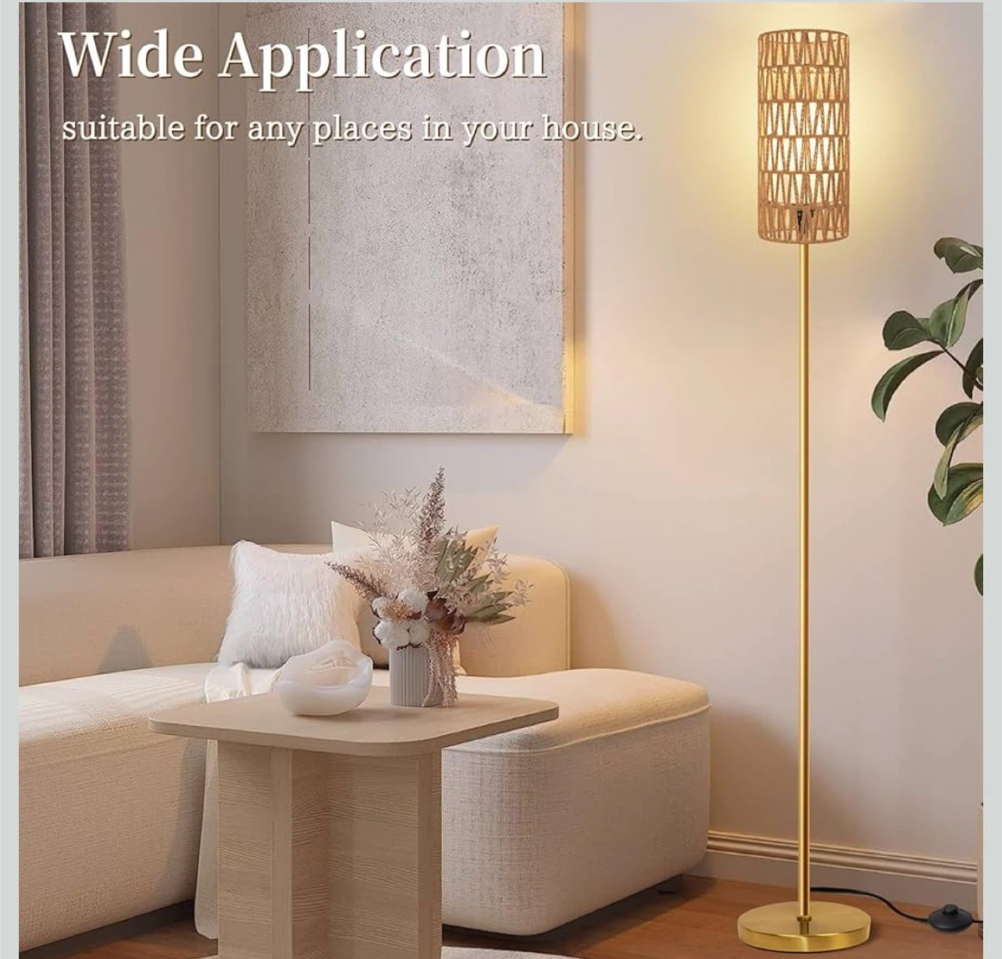 This floor lamp features a natural woven shade and a slim gold-toned stand. It comes with an LED light bulb. It's suitable for any room in your house! It provides warm ambient lighting.