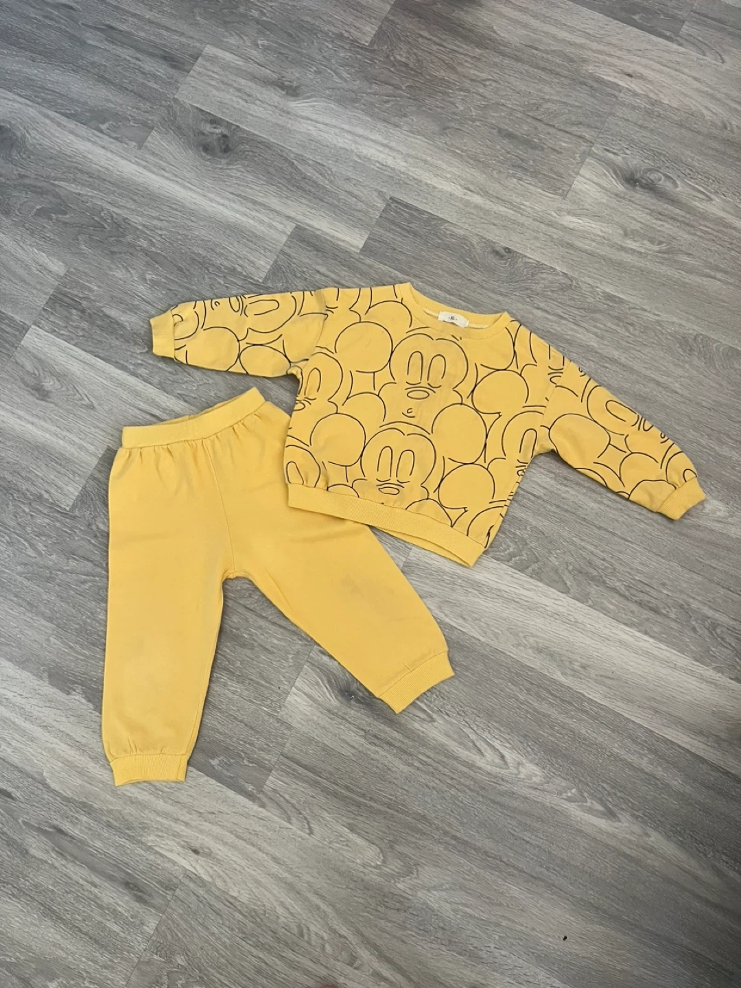 Cute yellow outfit featuring Mickey Mouse print! It includes a long-sleeved top and matching pants. Perfect for your little one to stay comfy and stylish.