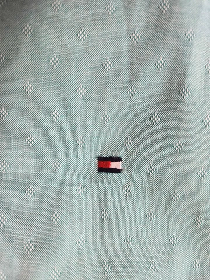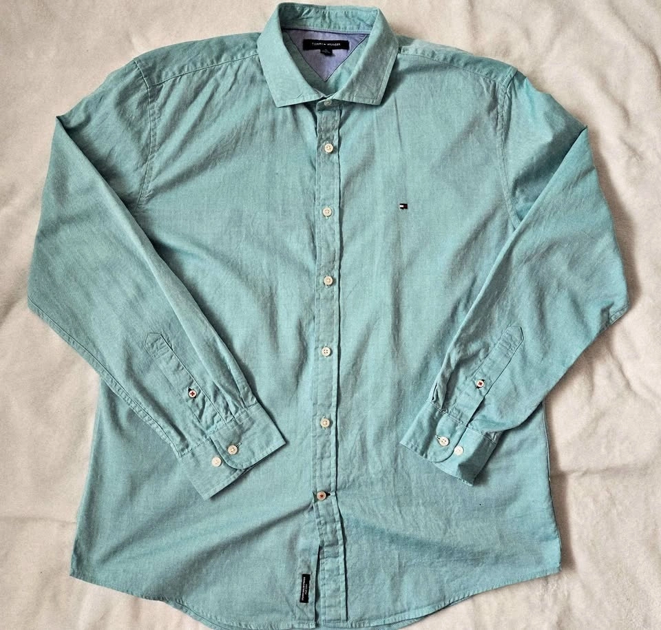 Stylish Tommy Hilfiger long sleeve button-down shirt. Light turquoise color with a subtle textured pattern. Size XL. Like new. Made with 100's 2ply fabric. Has the classic Tommy Hilfiger flag logo on the chest. Great for casual or dressier looks. Pickup in Lakeview in S.W.