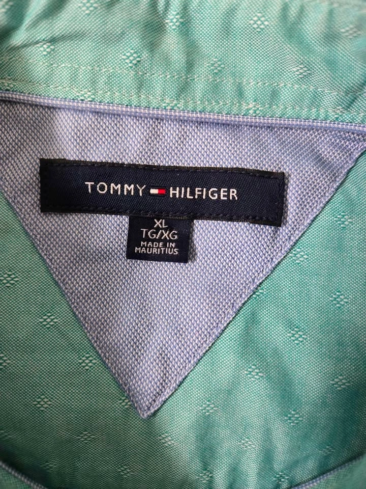 Stylish Tommy Hilfiger long sleeve button-down shirt. Light turquoise color with a subtle textured pattern. Size XL. Like new. Made with 100's 2ply fabric. Has the classic Tommy Hilfiger flag logo on the chest. Great for casual or dressier looks. Pickup in Lakeview in S.W.