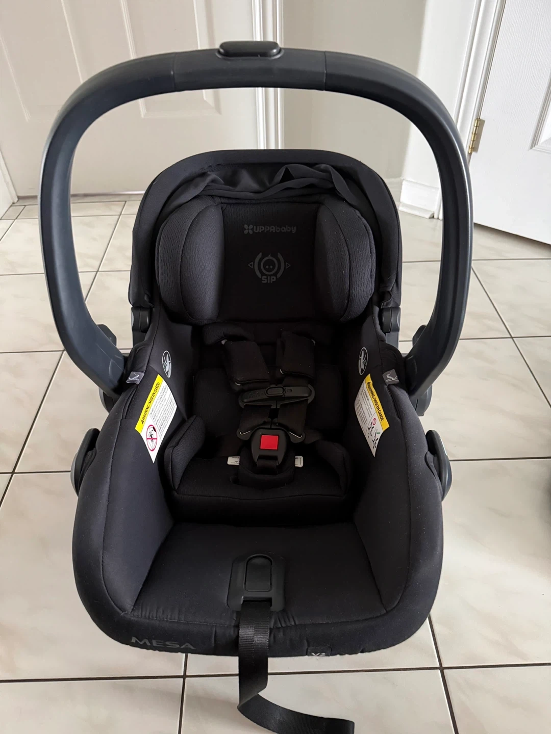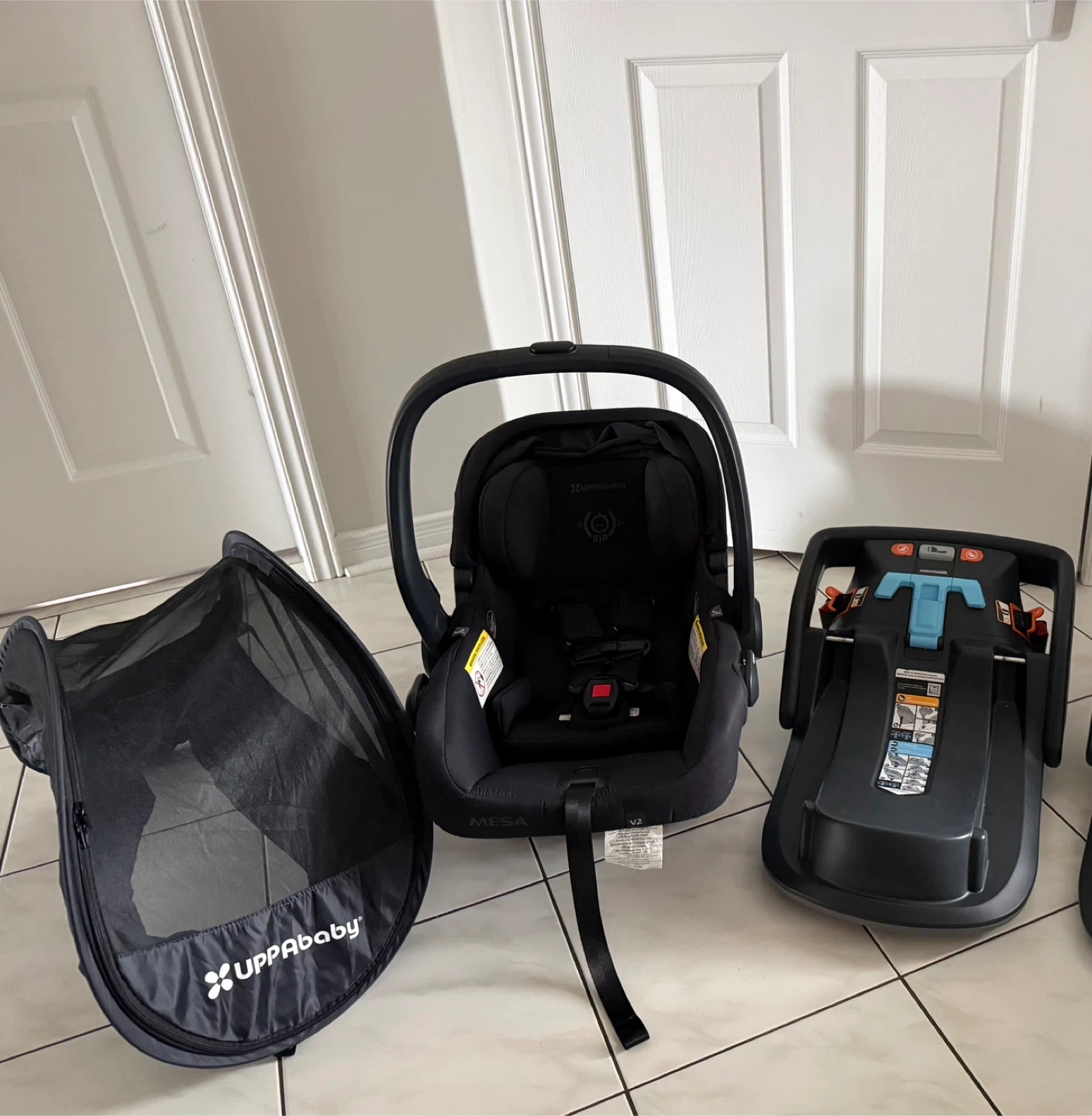 UPPAbaby MESA V2 infant car seat and base. Includes a black UPPA baby sunshade with zipper closure. This car seat system is black and designed for infants.