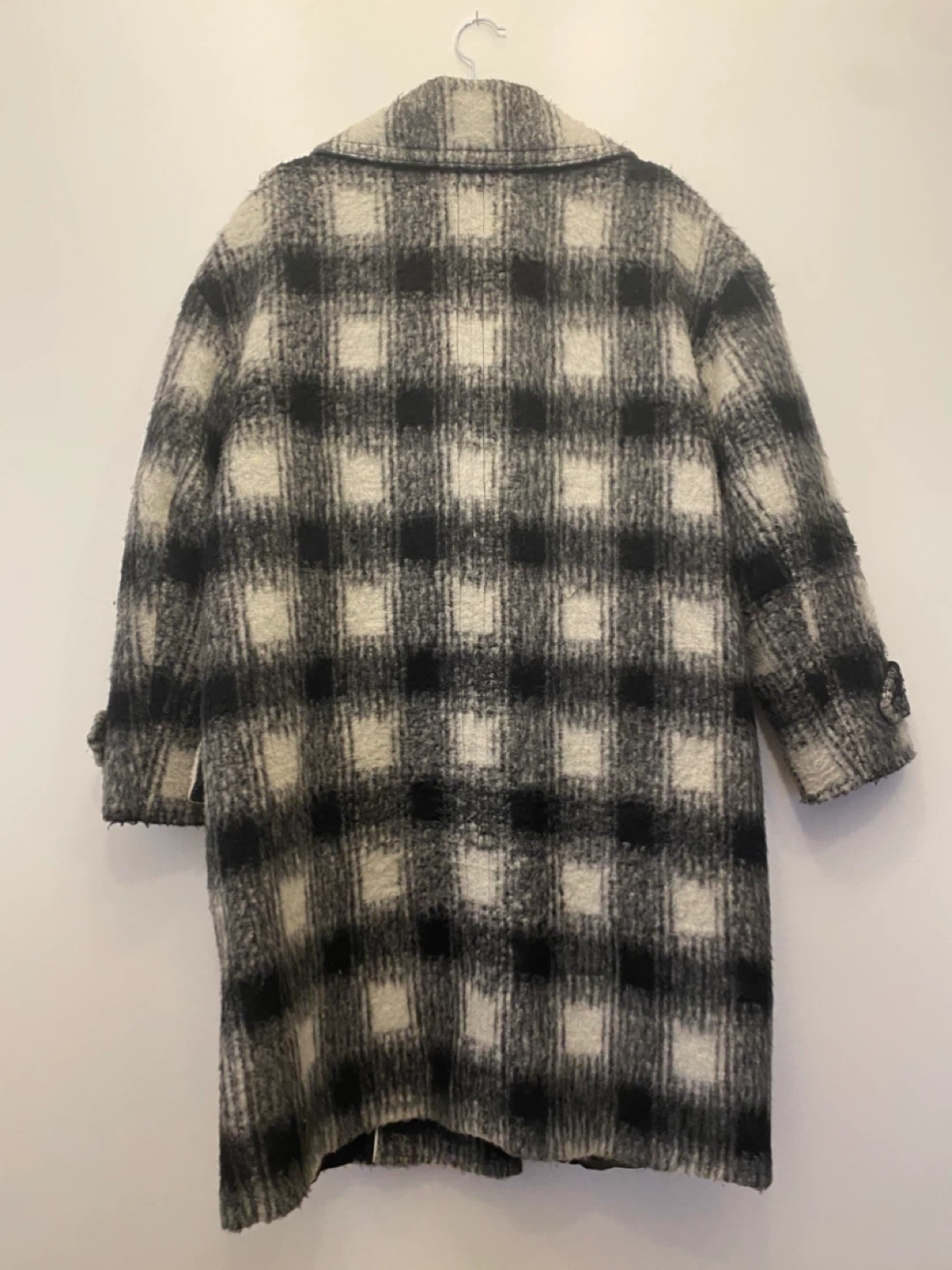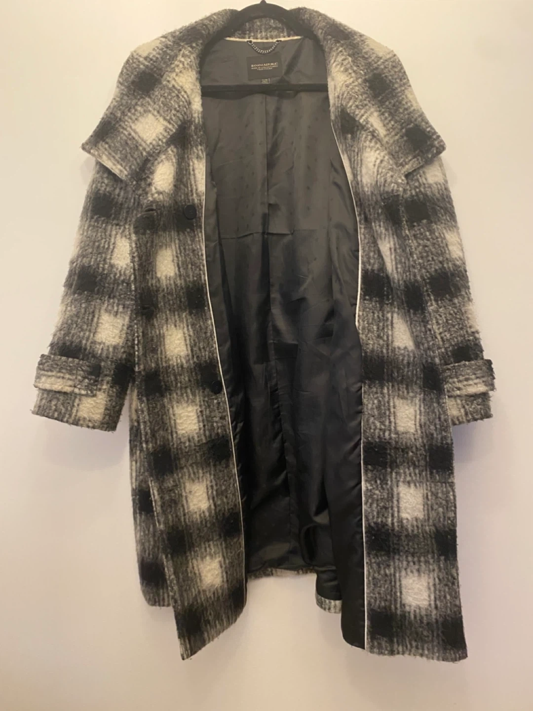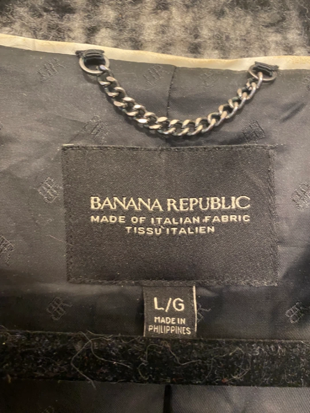 This Banana Republic coat is made from Italian fabric. It's a size L/G and features a classic plaid pattern. The coat is double-breasted with button closure.