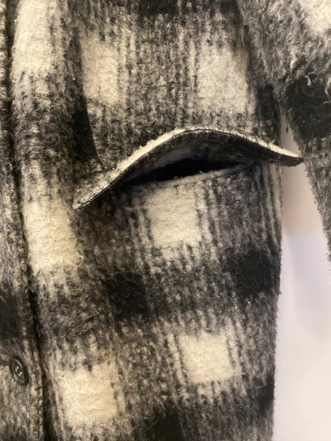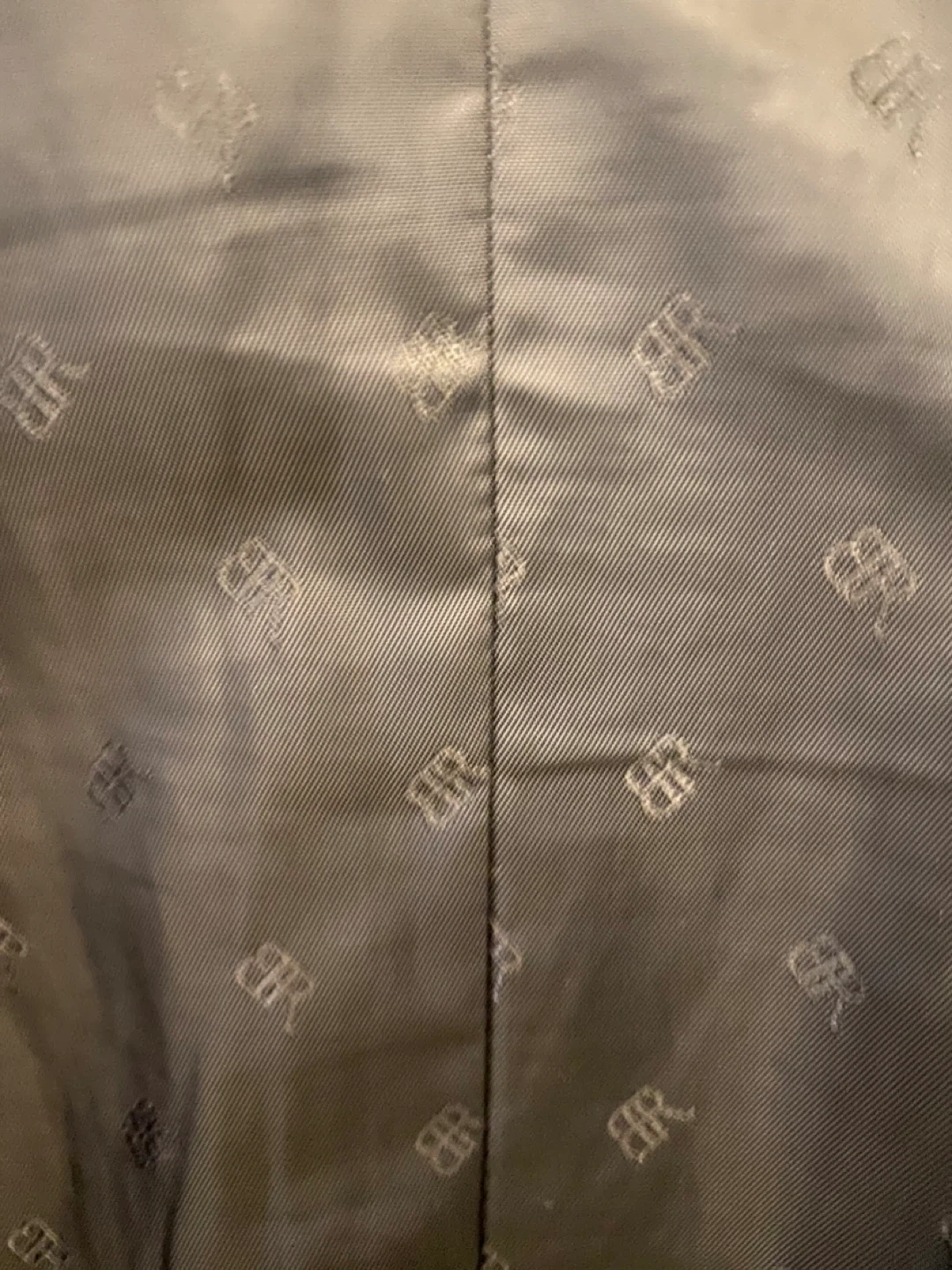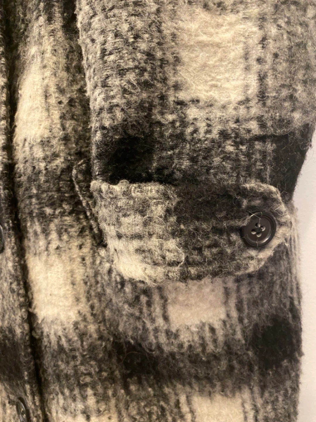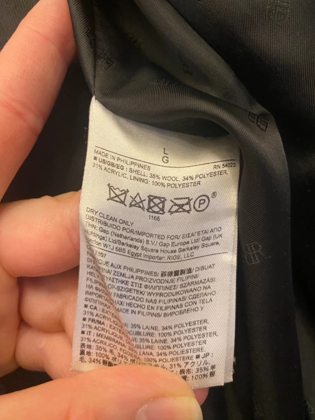 This Banana Republic coat is made from Italian fabric. It's a size L/G and features a classic plaid pattern. The coat is double-breasted with button closure.