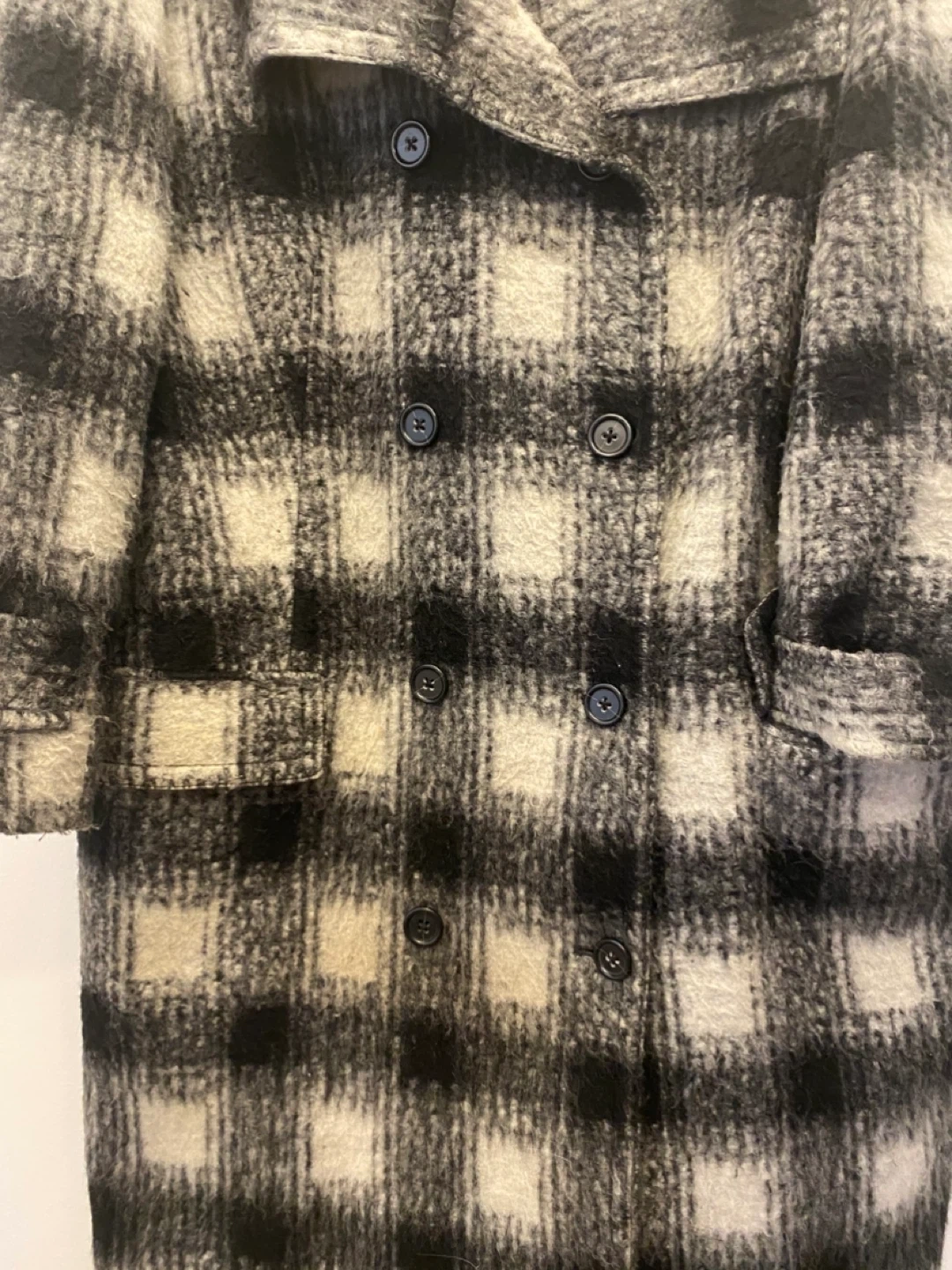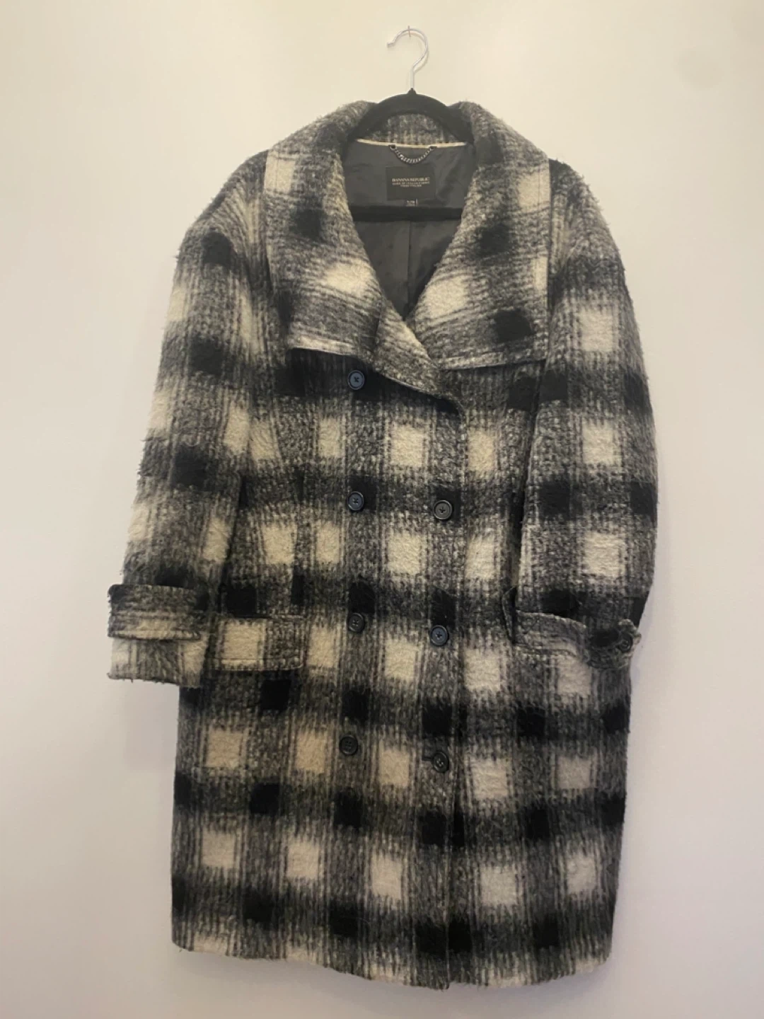 This Banana Republic coat is made from Italian fabric. It's a size L/G and features a classic plaid pattern. The coat is double-breasted with button closure.