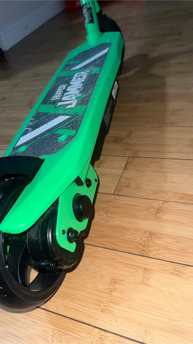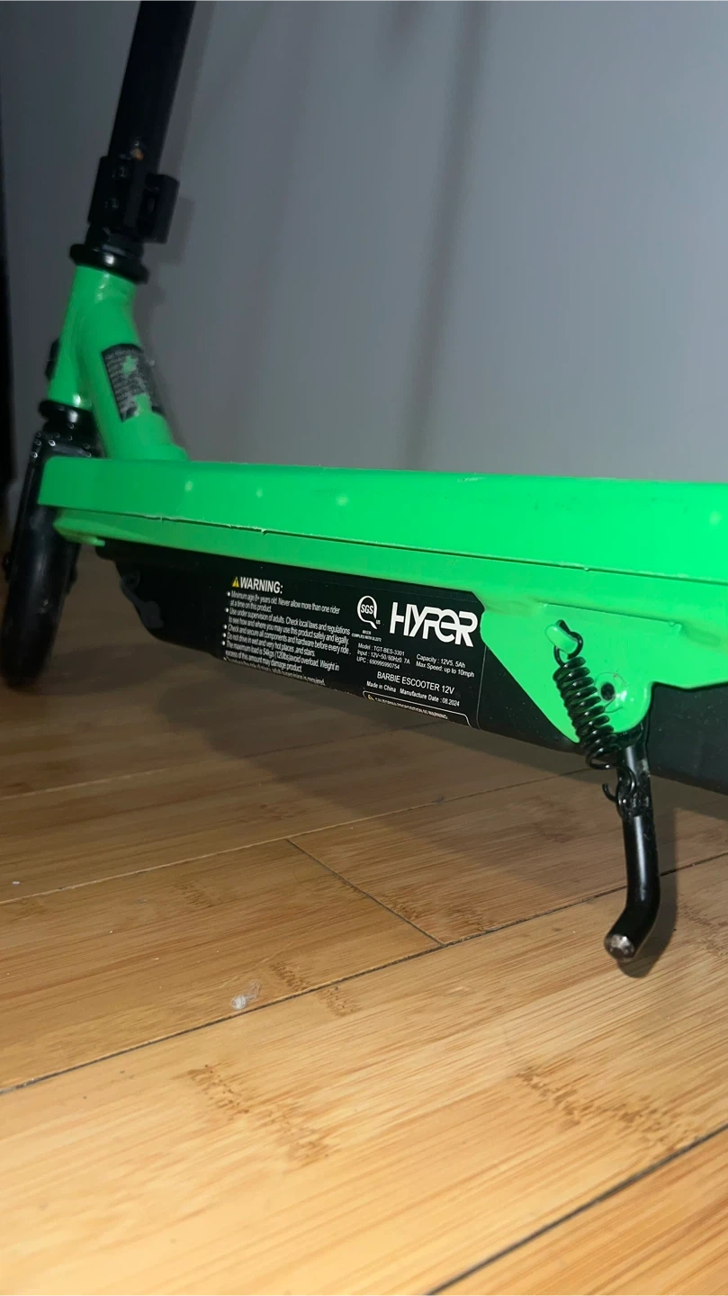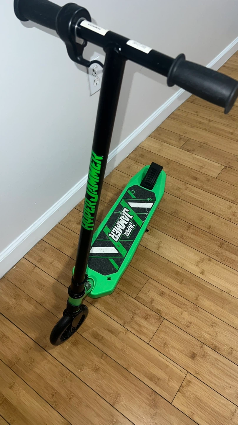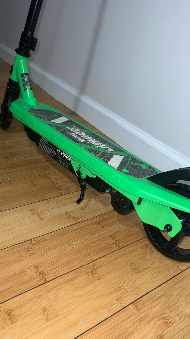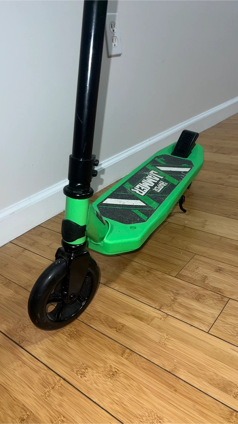 This is a green Hyper Hammer electric scooter. It's a fun ride for kids! The scooter is designed for easy use and enjoyment.