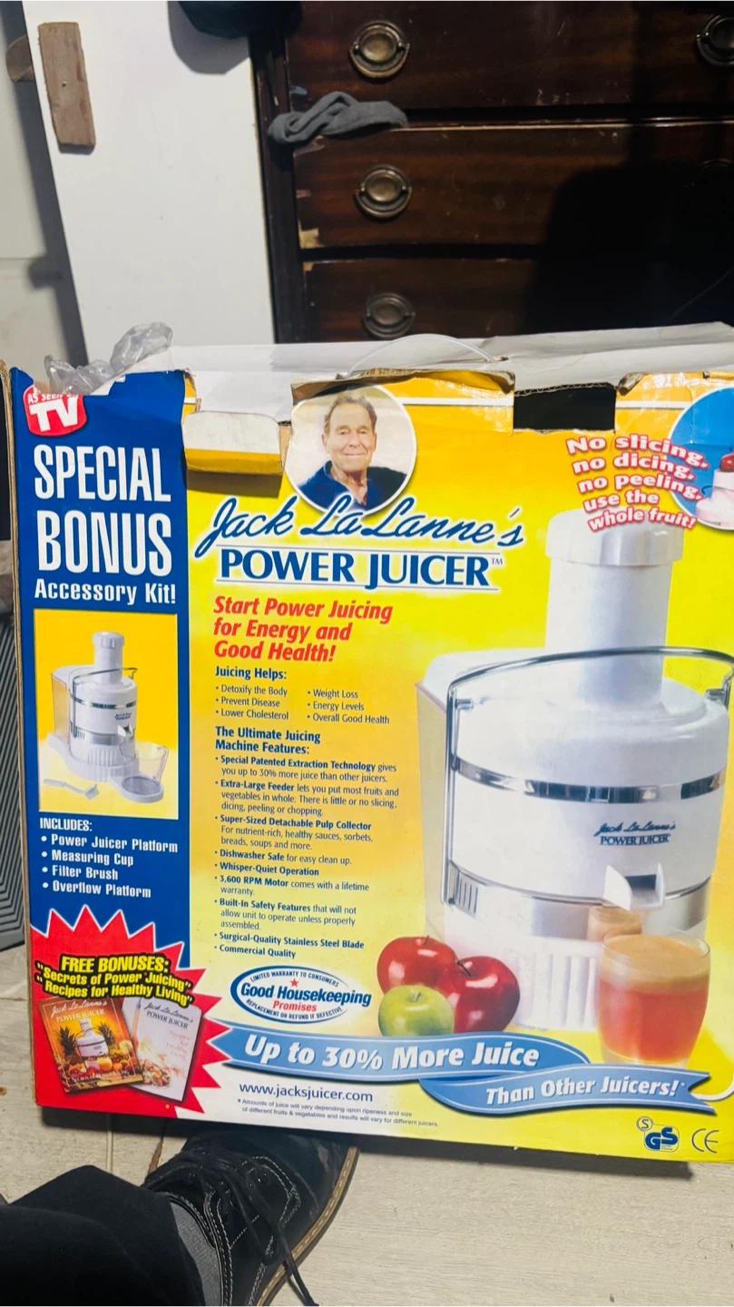 Start power juicing for energy and good health with this Jack LaLanne's Power Juicer. It features special patented extraction technology for up to 30% more juice and an extra-large feeder. The unit is dishwasher safe and has a whisper-quiet operation with a 3,600 RPM motor.