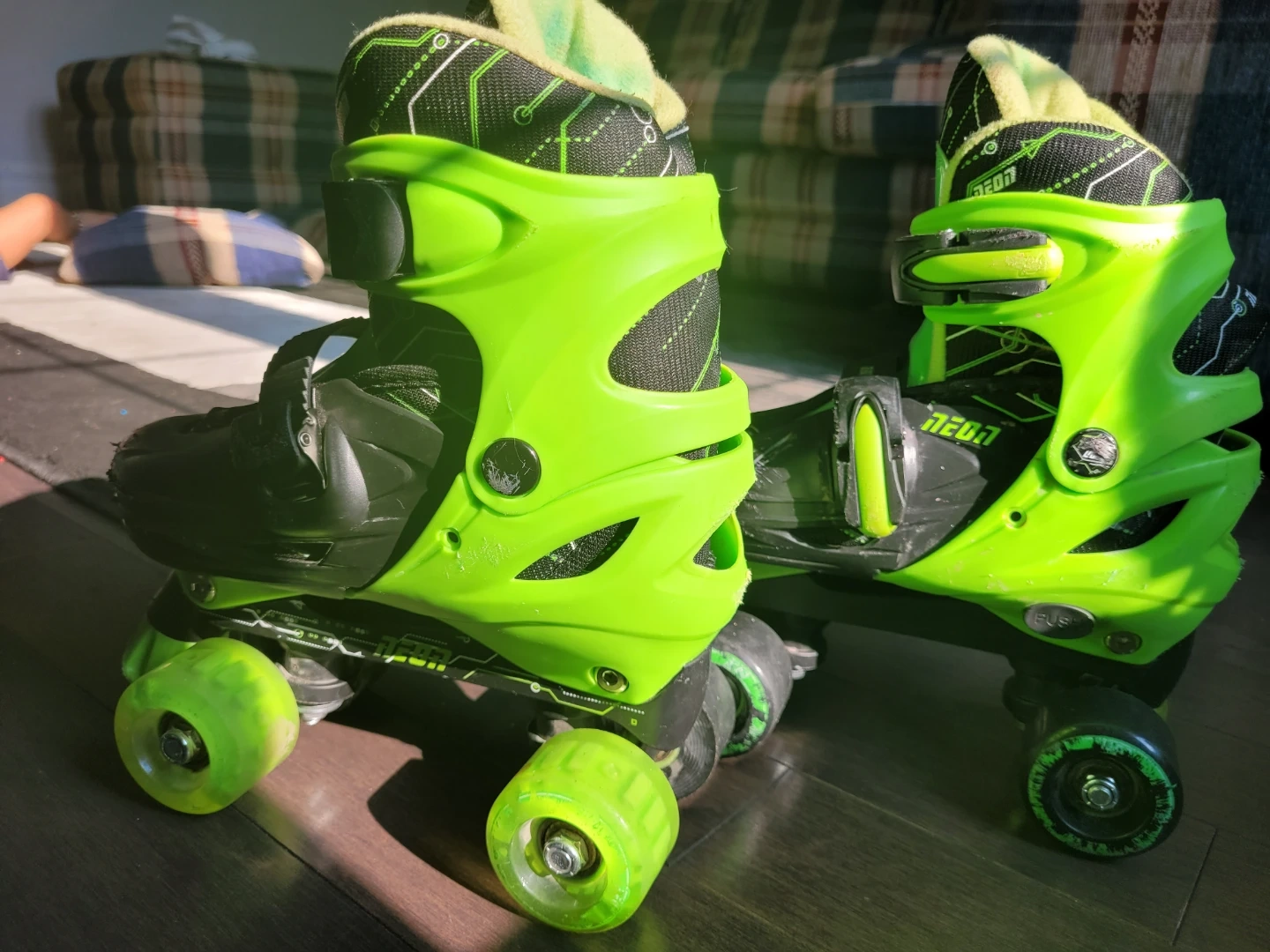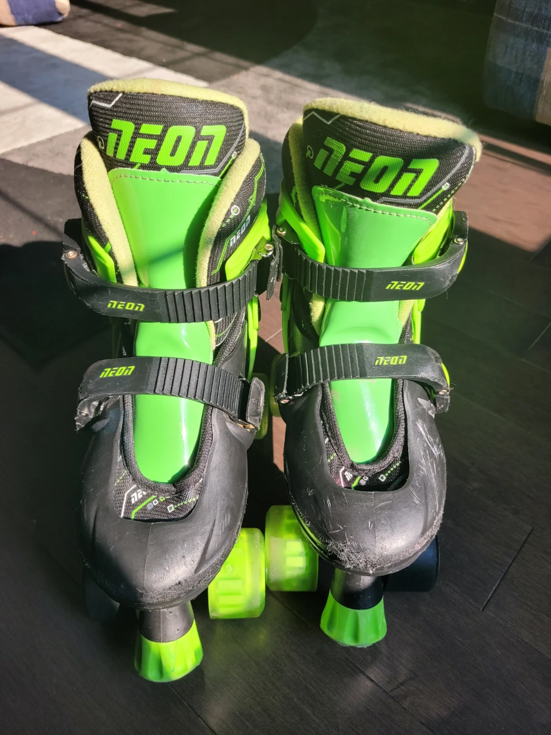 These Neon roller skates are bright green and black. They feature adjustable straps for a secure fit. Great for learning to skate!