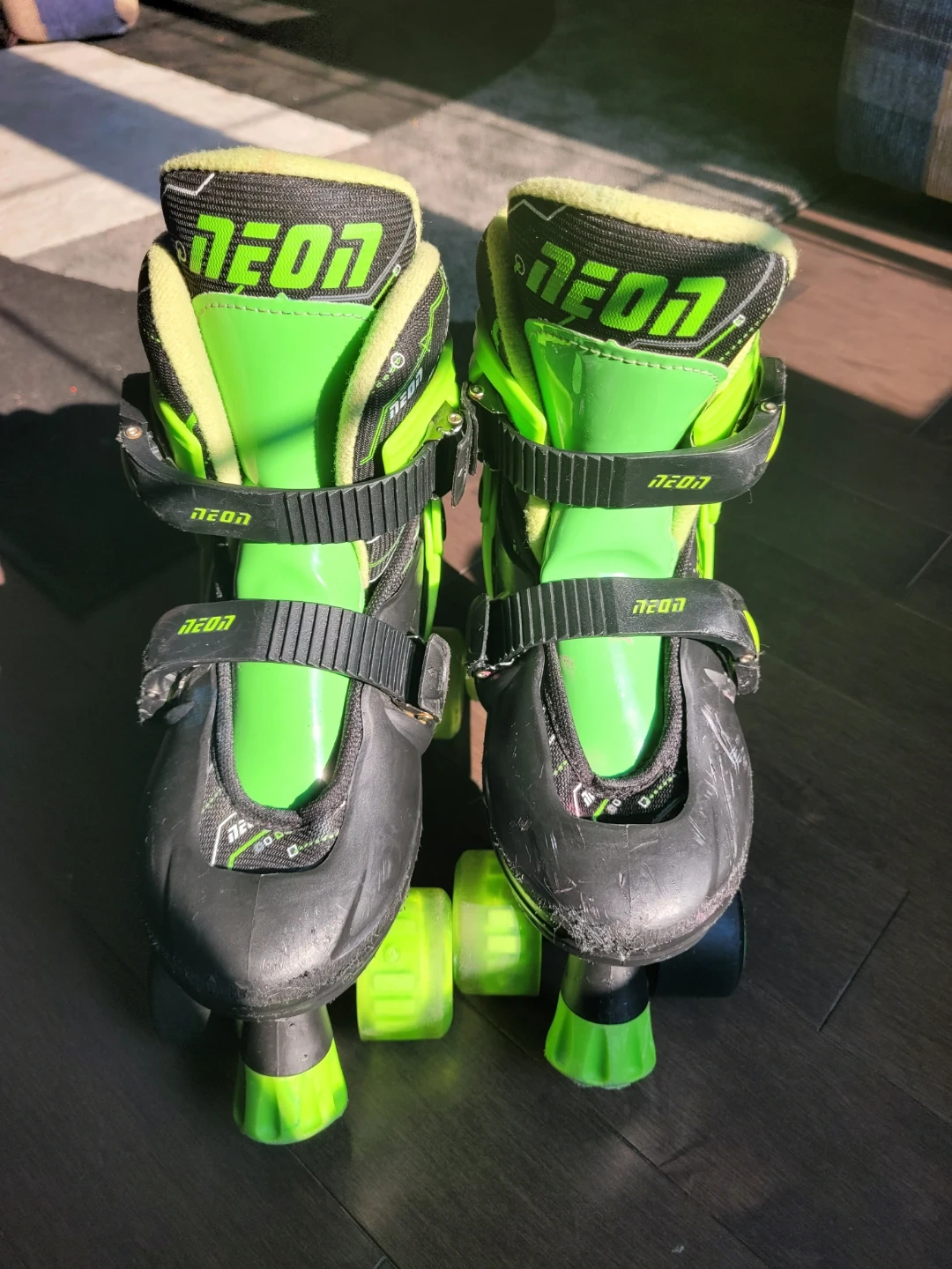 These Neon roller skates are bright green and black. They feature adjustable straps for a secure fit. Great for learning to skate!