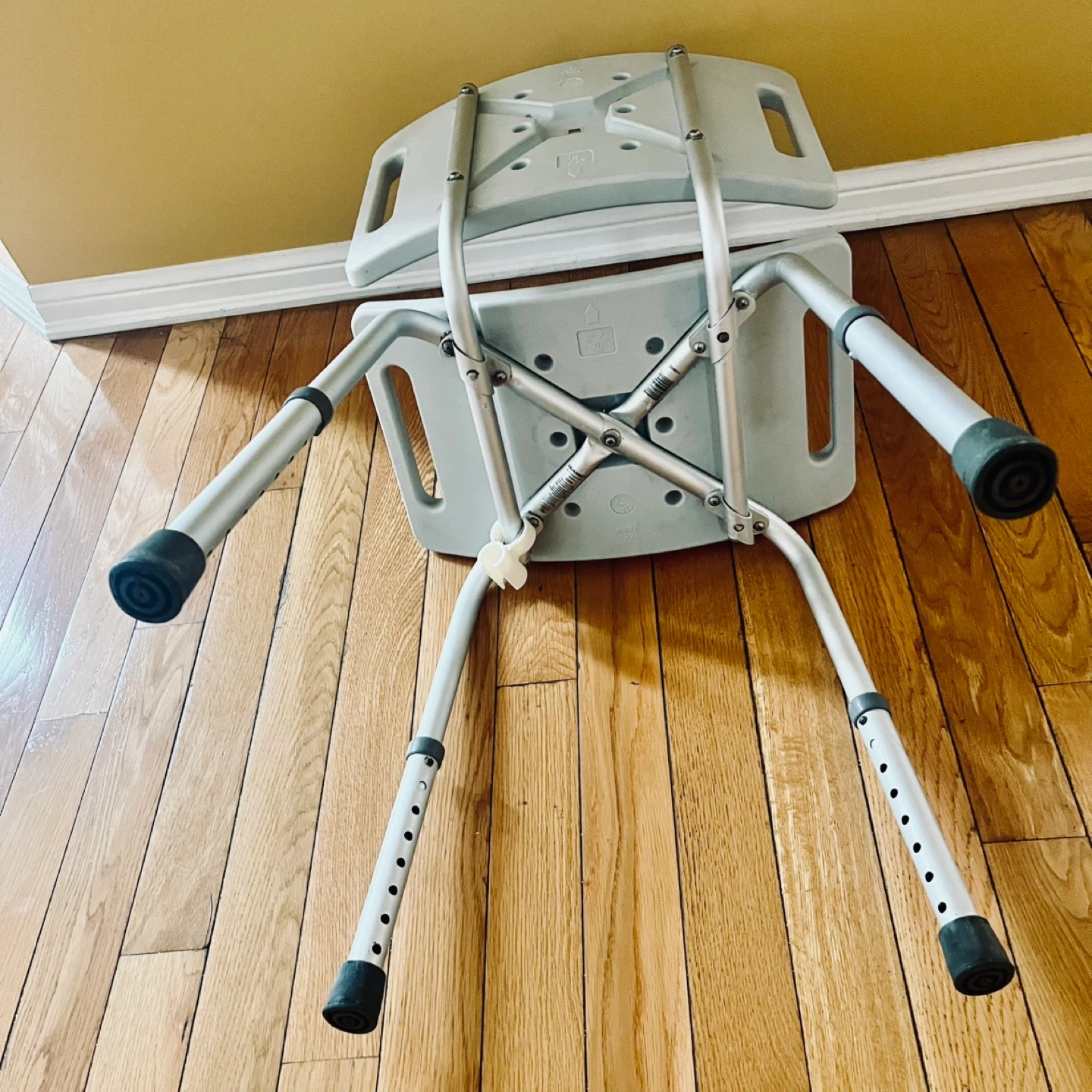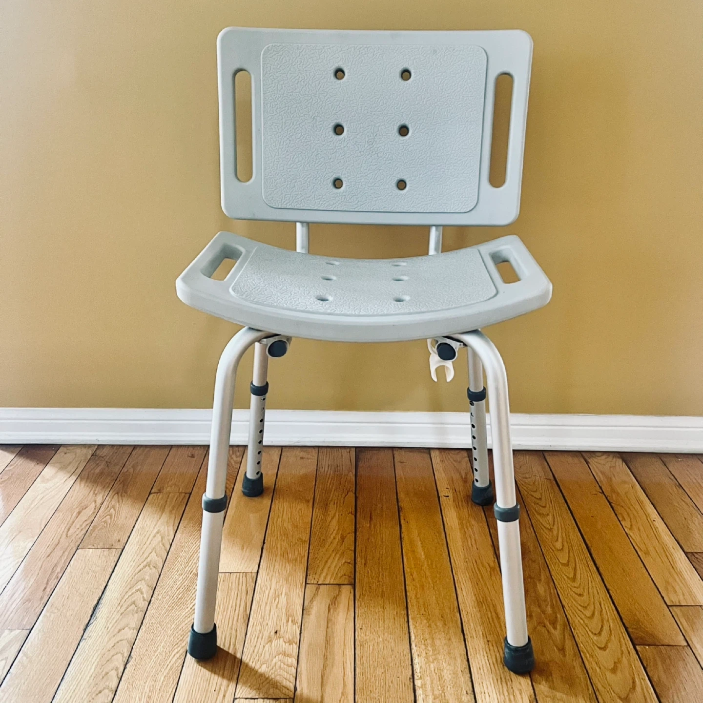 This bath chair provides a sturdy seating option for your shower. It's constructed with a durable plastic seat and backrest. The height is adjustable to suit your needs.
