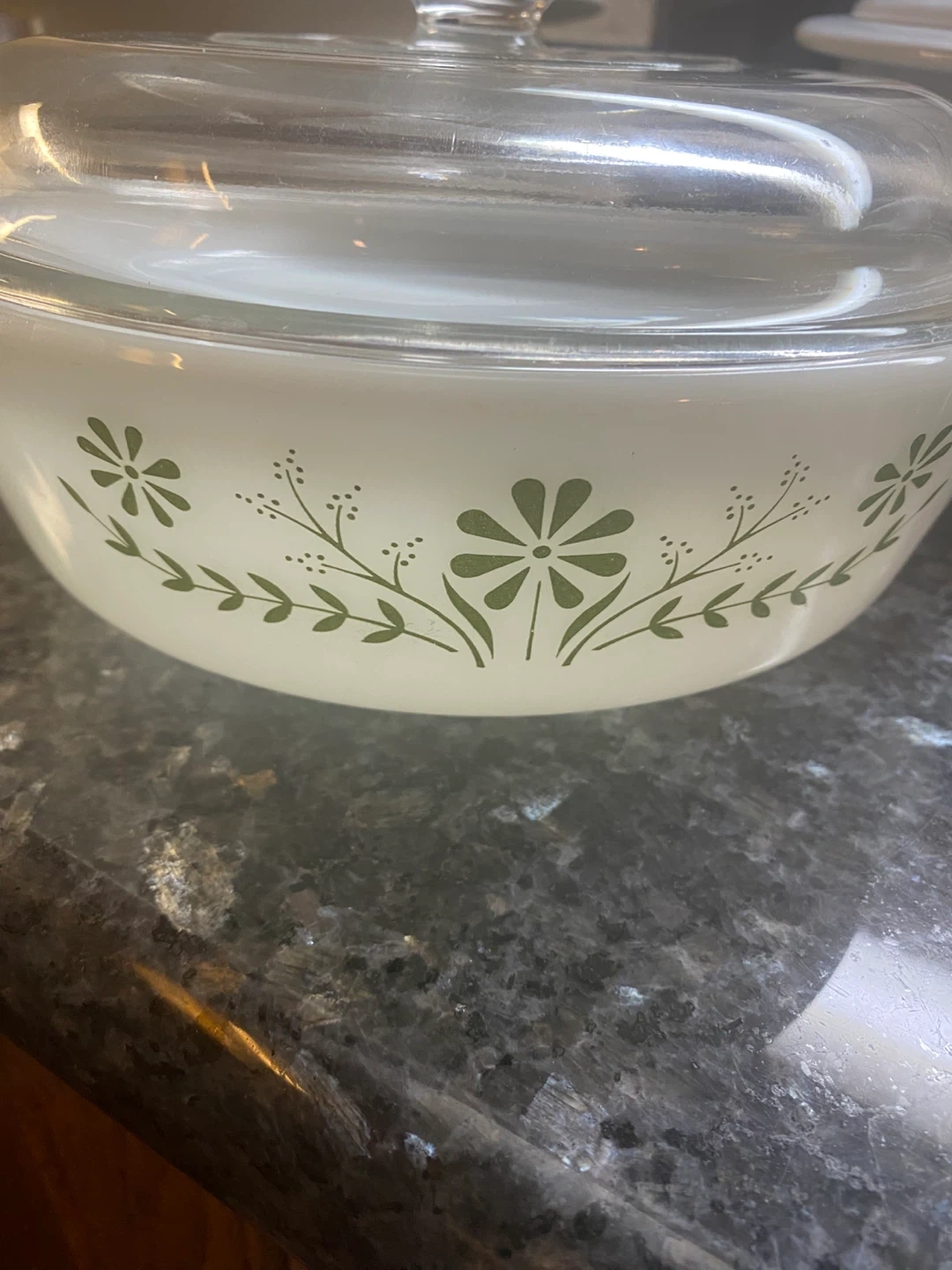 Selling a lovely vintage Pyrex casserole dish! It's white with a green floral pattern and comes with a clear glass lid. A charming addition to any kitchen!