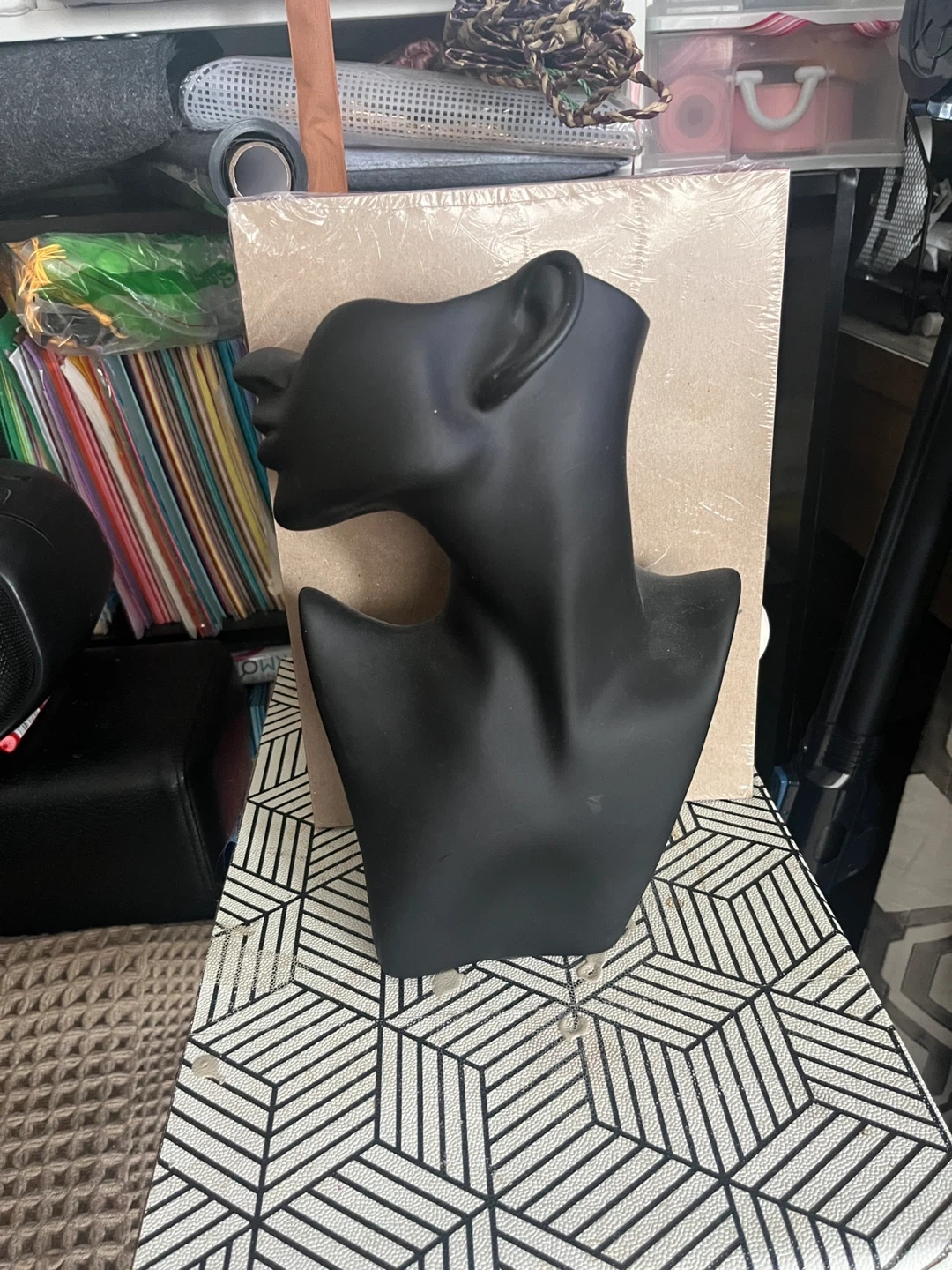 Set includes a black bust for displaying necklaces and two black hands for bracelets or rings. These displays are made of a glossy plastic material. Perfect for showcasing jewelry in a shop or at home!