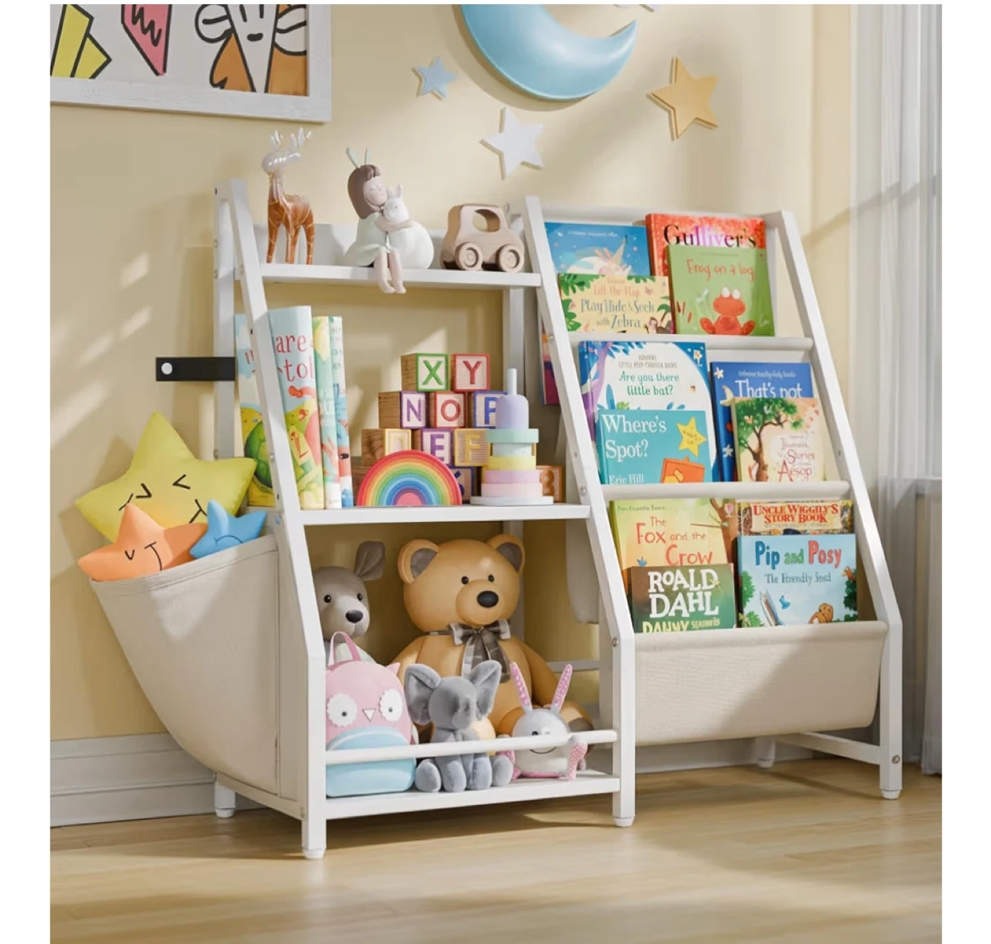 This bookshelf is perfect for organizing your child's books and toys. It features multiple shelves and two fabric storage bins to keep things tidy. Its low height makes it easy for kids to reach their favourite items!