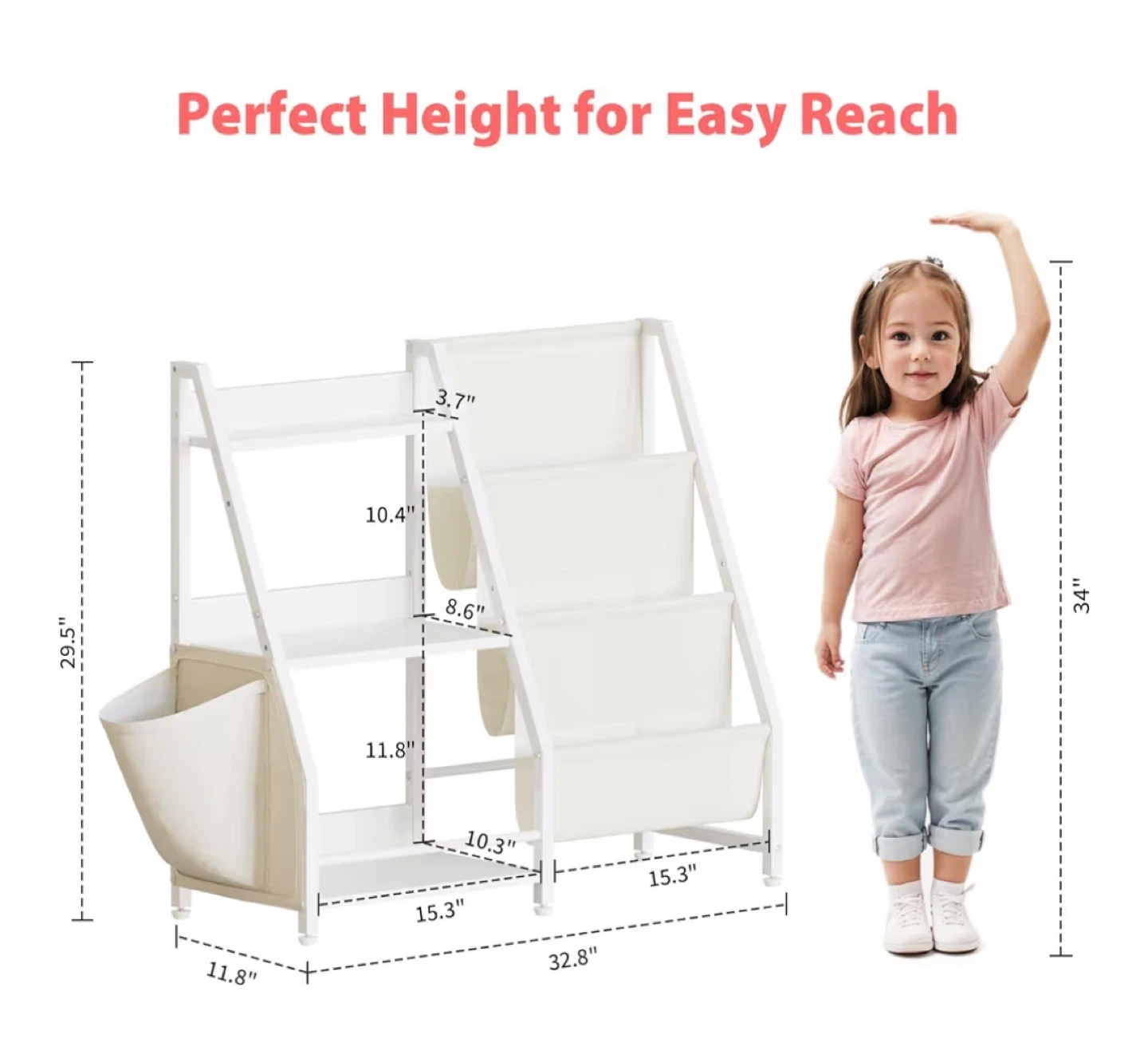 This bookshelf is perfect for organizing your child's books and toys. It features multiple shelves and two fabric storage bins to keep things tidy. Its low height makes it easy for kids to reach their favourite items!
