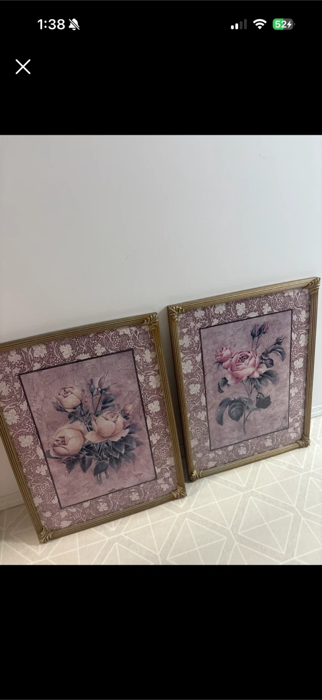 A set of two framed pictures featuring floral rose designs. Each picture has a decorative border and is housed in a gold-toned frame. The artwork depicts soft pink and cream roses. Pick up cash only