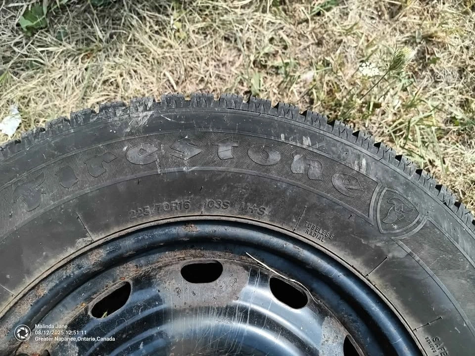 Set of 4 Firestone Winter Force 2 tires, 5 bolt pattern, 225/70/16. They are on steel rims. Used one season with lots of tread remaining. Stored indoors, no cracks or leaks. $500 firm. As is.