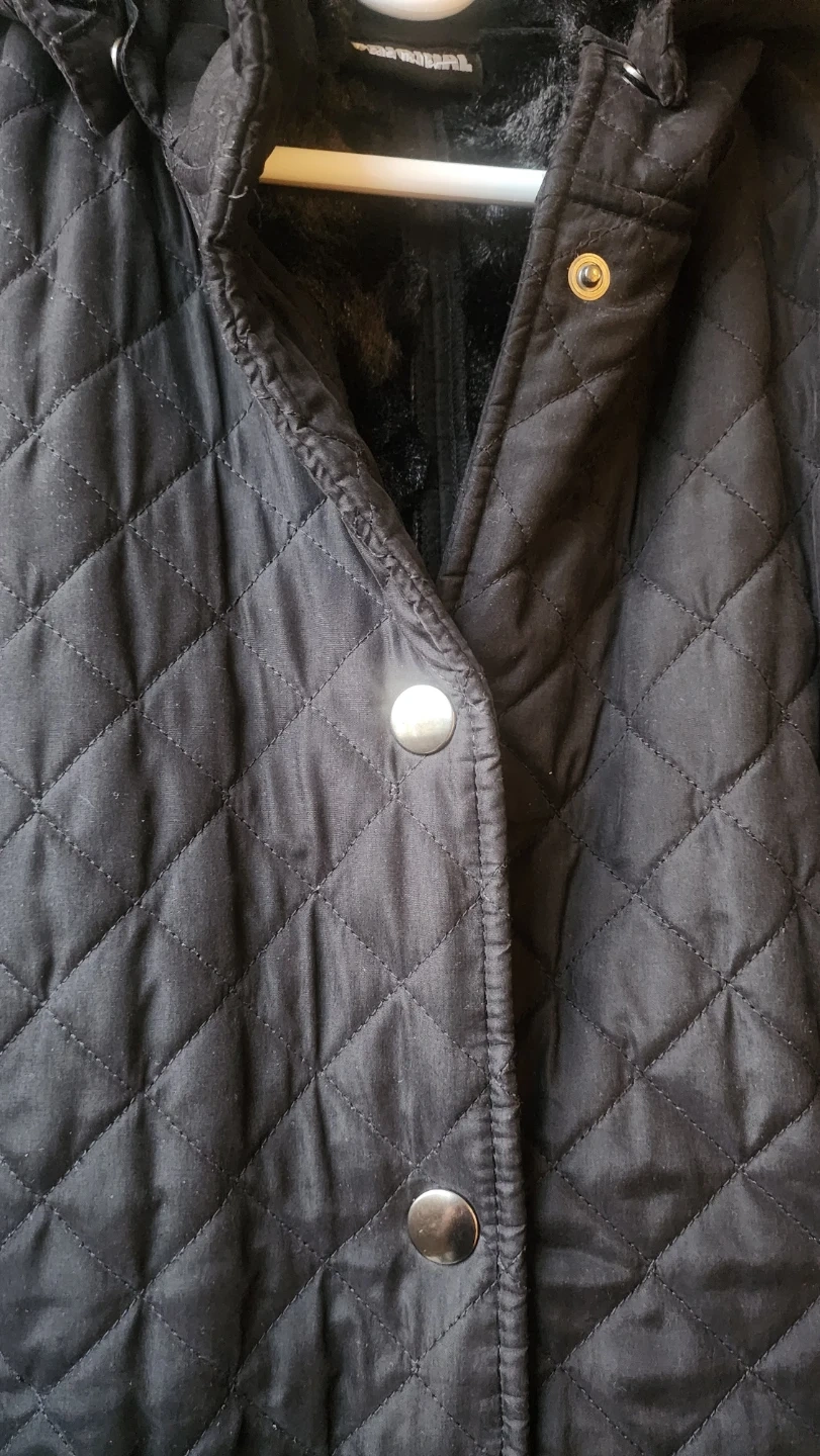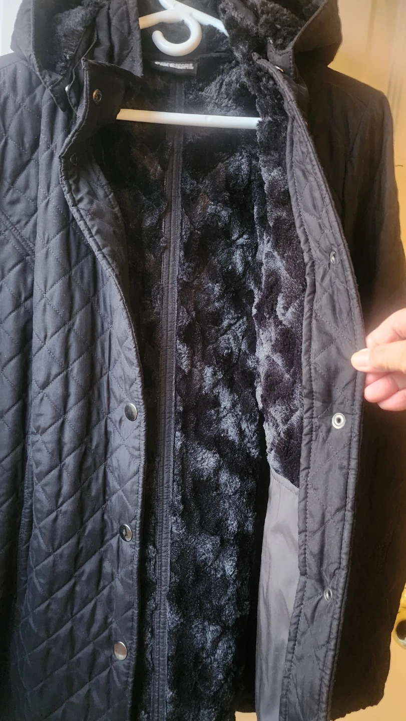 Here's a cozy black quilted winter coat from Original! It features a hood with faux fur trim and a belted back. Perfect for staying warm this winter season