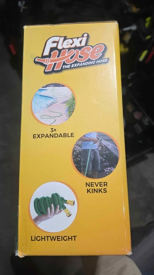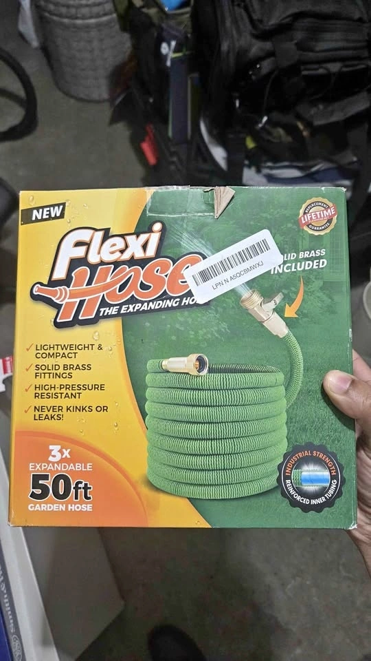 This is a 50ft expanding garden hose. Super lightweight and compact, has solid brass fittings and is high-pressure resistant. Never kinks or leaks, and it expands 3x its size.