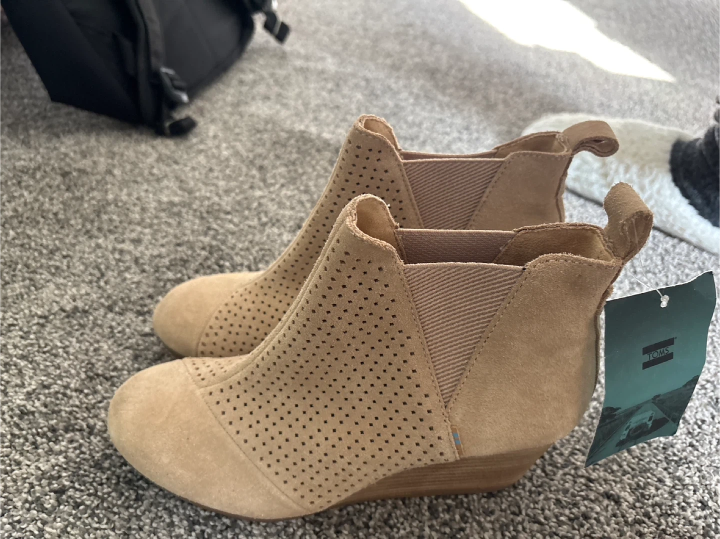 Brand New Size 7.5/8 TOMS Beige Suede Perforated Wedge Booties