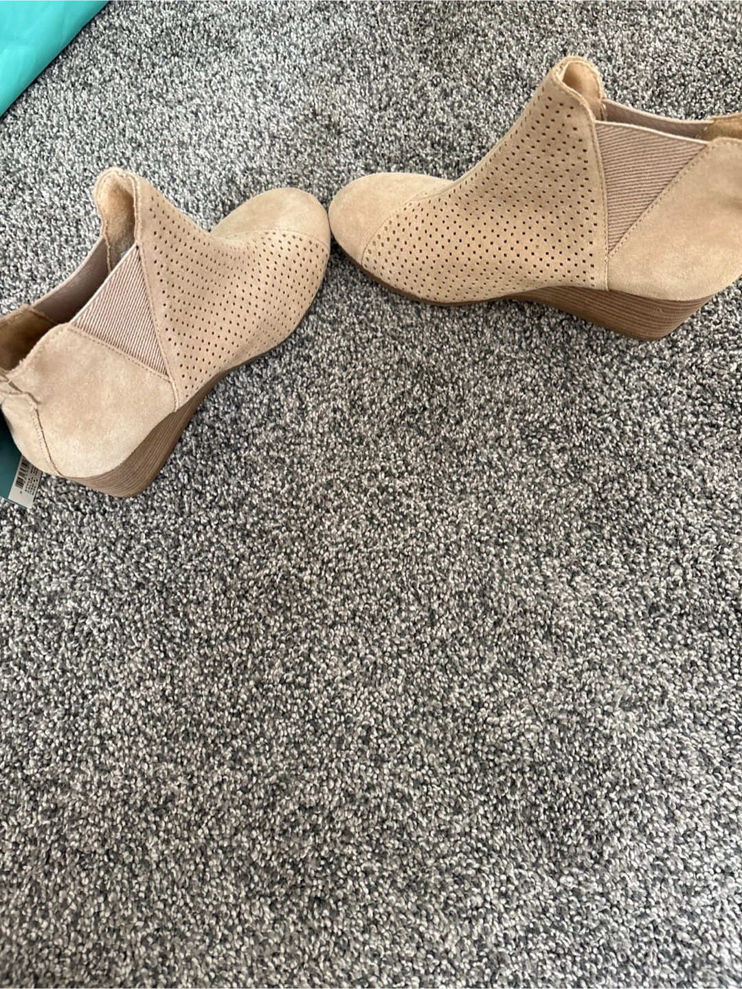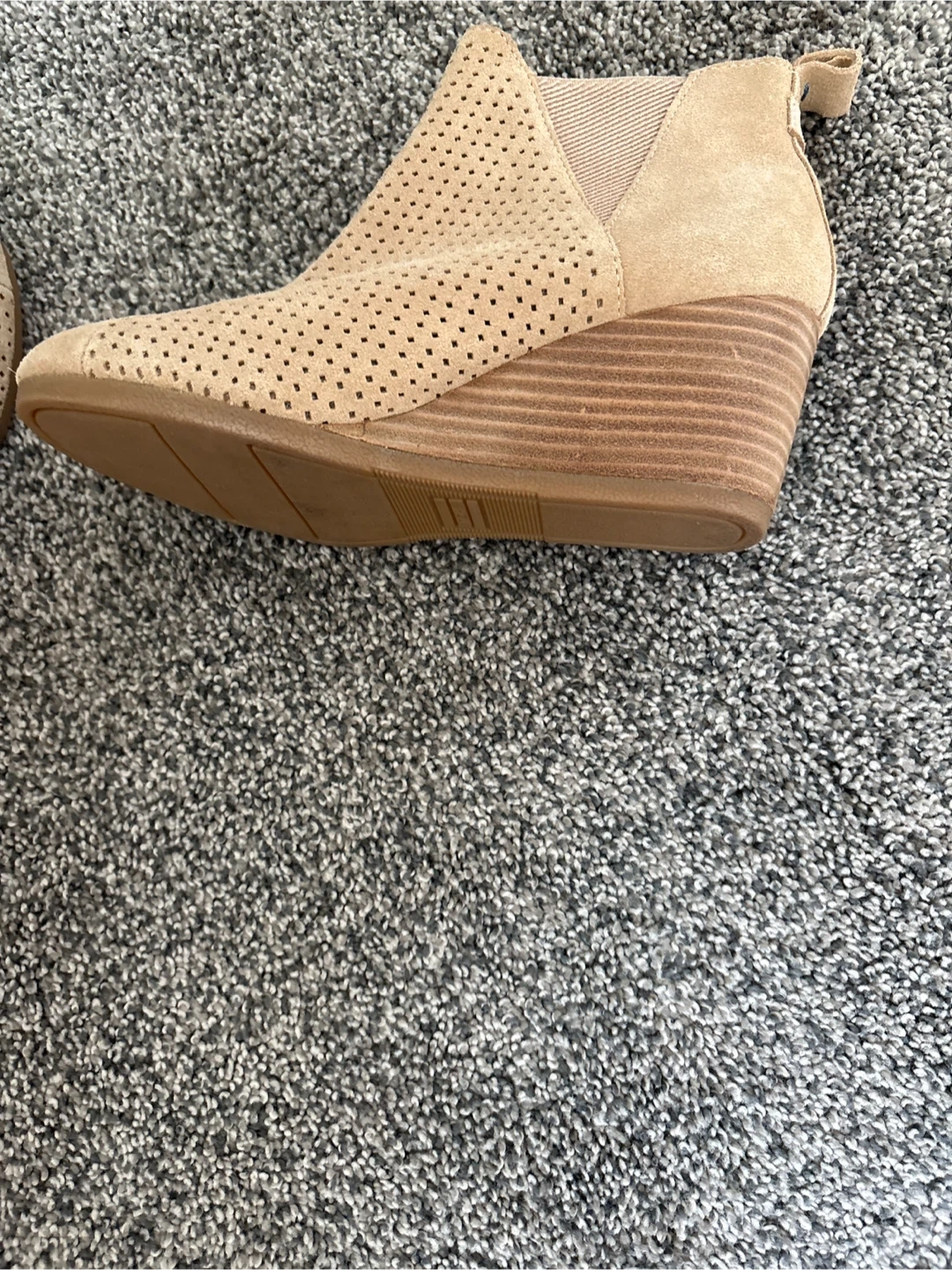 Cute beige suede booties from TOMS. They feature a perforated design and elastic gore for easy on and off. Wedge heel for a little lift! Size 8, fits 7.5-8
