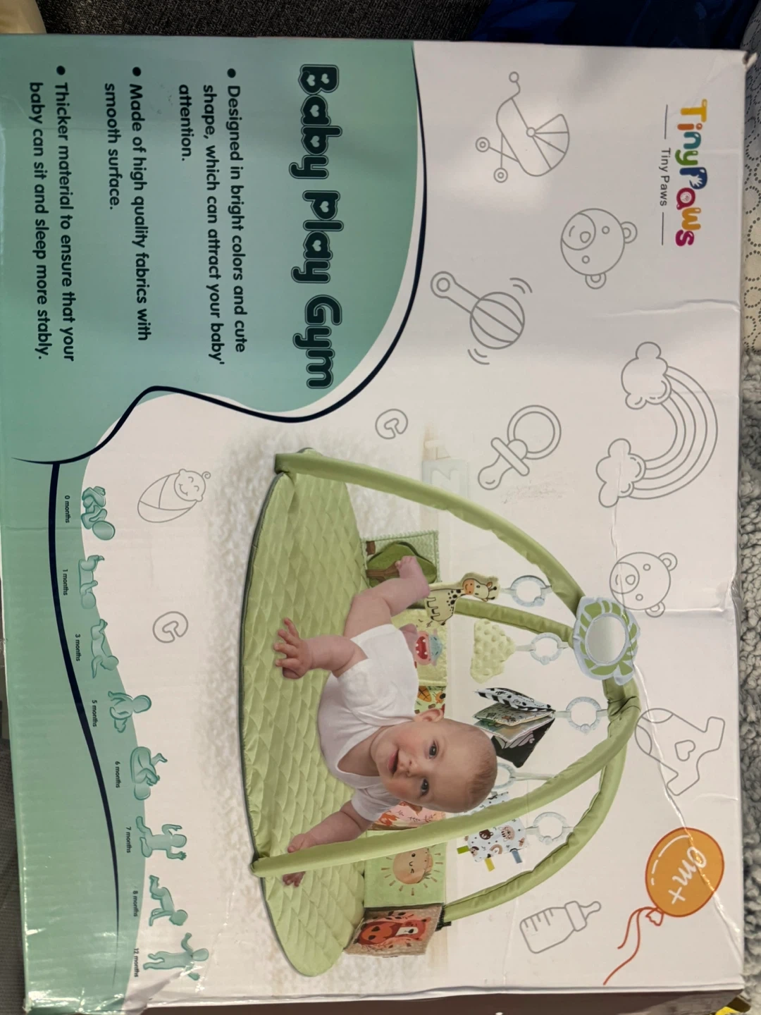 Selling a Tiny Paws Baby Play Gym, suitable for newborns and up (0m+). It's designed with bright colours and cute shapes to attract your baby's attention. The mat is made of high-quality fabric with a smooth surface, and it's thicker to ensure your baby can sit stably. Comes with baby vision stimulus cards too