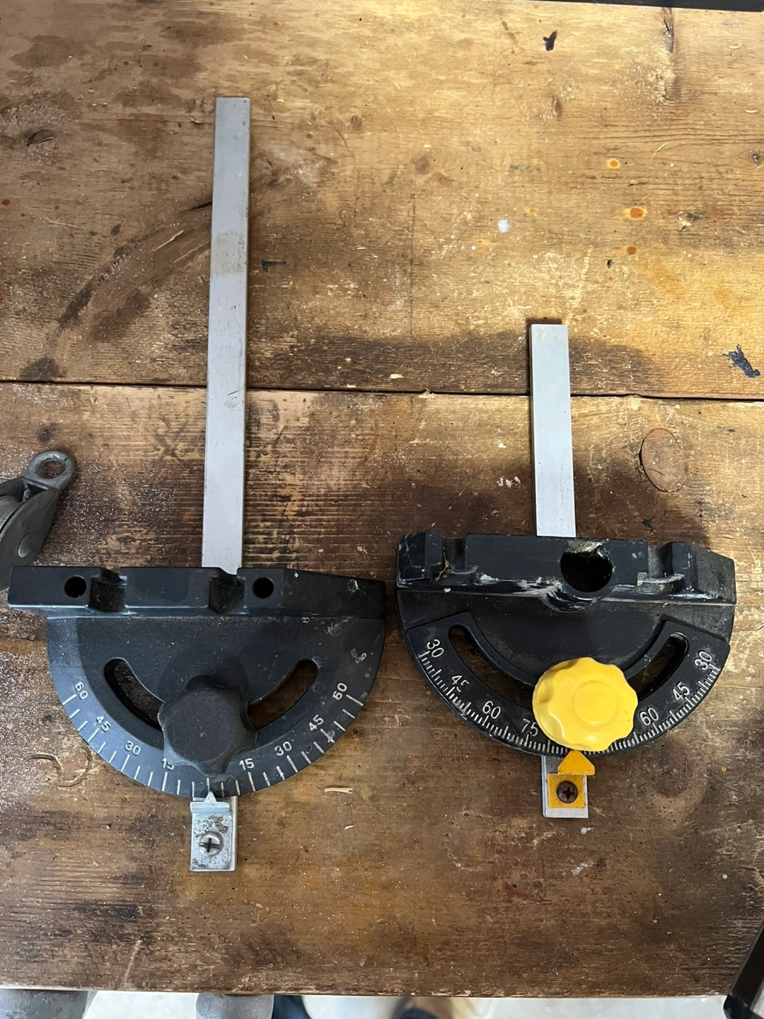 Two mitre gauges for table saw. Black plastic bodies with metal guides. Adjustable angle settings. $40 each.