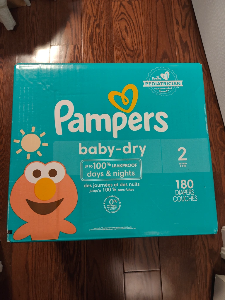 Selling a box of Pampers Baby-Dry diapers, size 2. This box contains 180 diapers, perfect for little ones weighing 12-18 lbs (5-8 kg). They offer up to 100% leakproof protection for days and nights