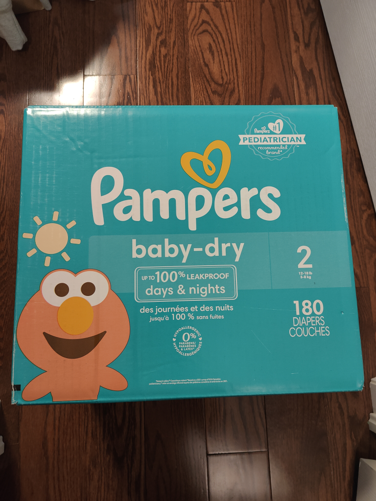 Selling a box of Pampers Baby-Dry diapers, size 2. This box contains 180 diapers, perfect for little ones weighing 12-18 lbs (5-8 kg). They offer up to 100% leakproof protection for days and nights