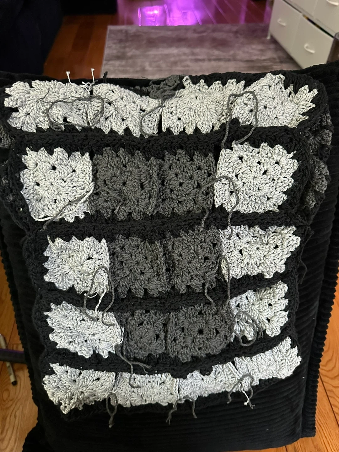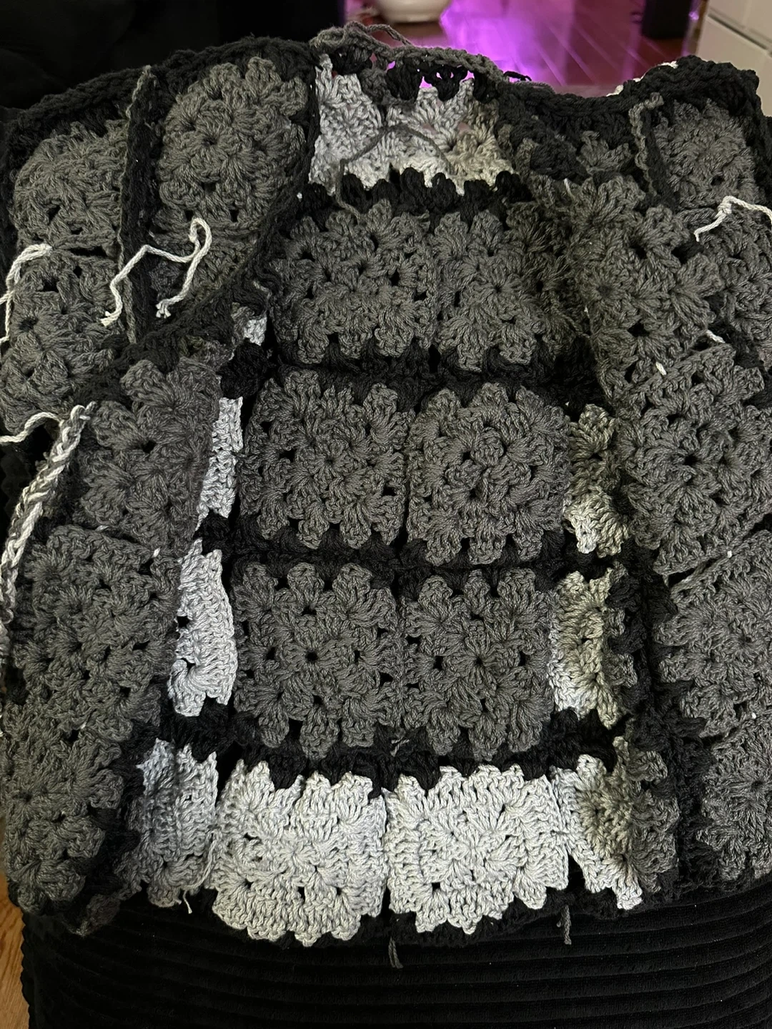 Selling a handmade crochet vest. It's a unique piece with a gray and black color scheme. It’s brand new and made with love!