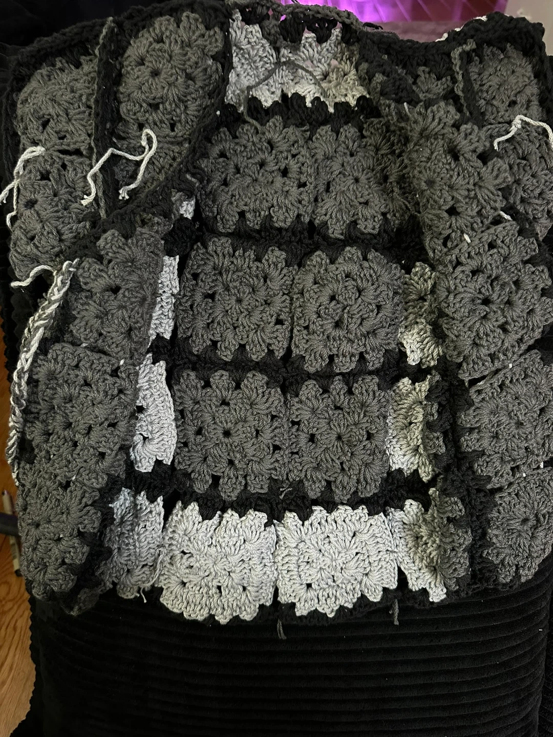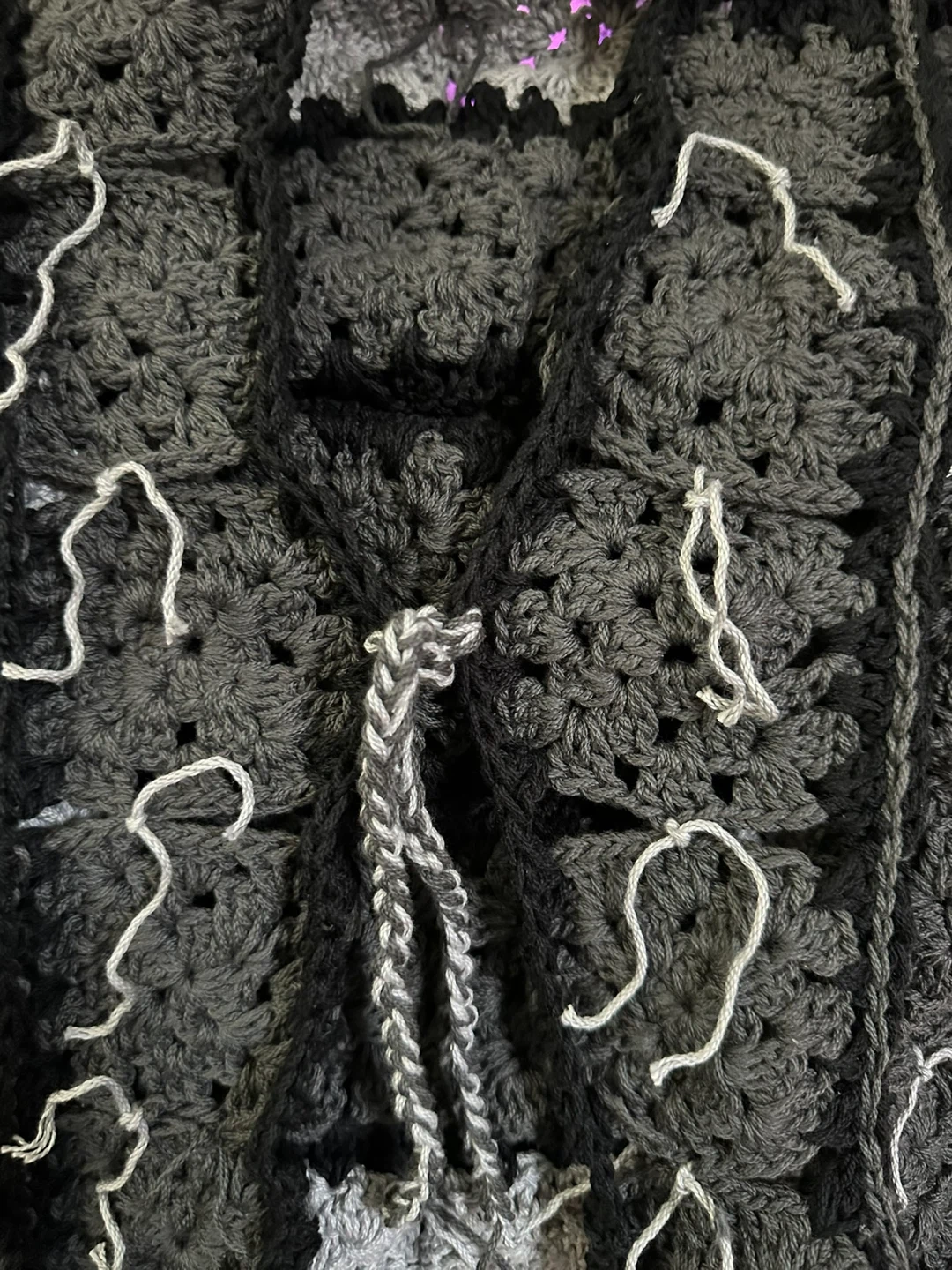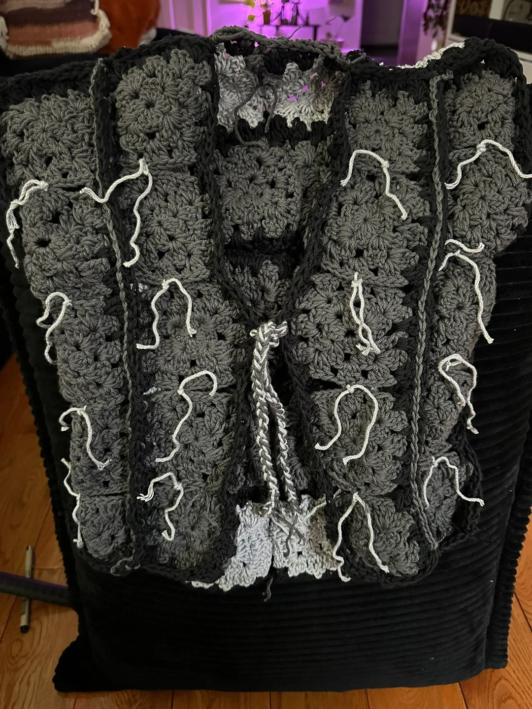 Selling a handmade crochet vest. It's a unique piece with a gray and black color scheme. It’s brand new and made with love!