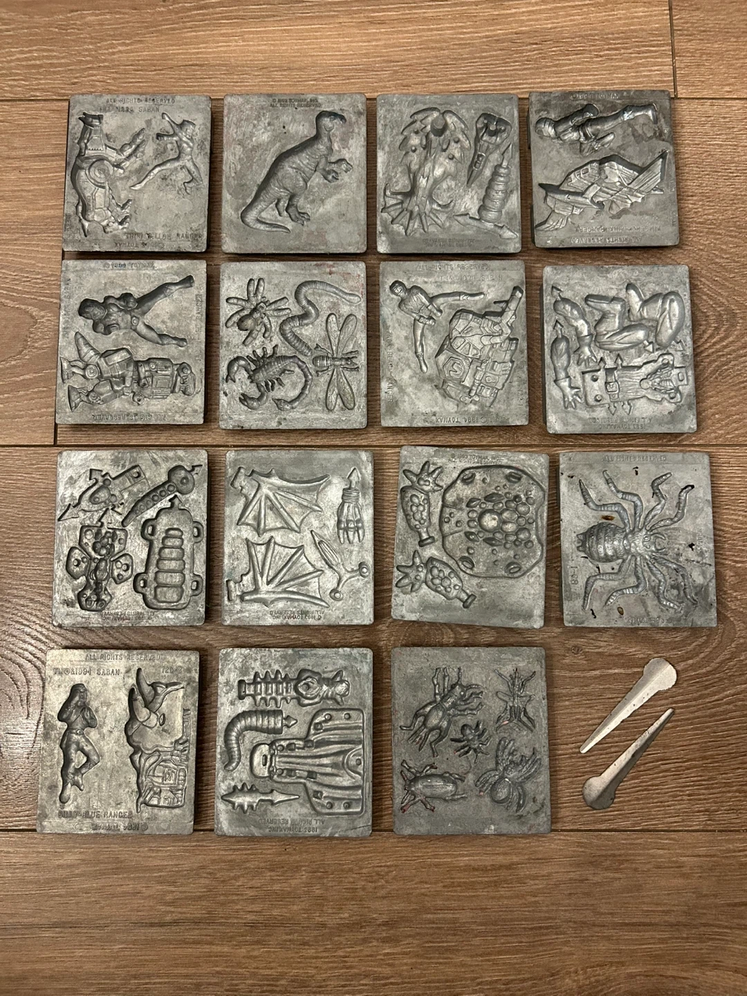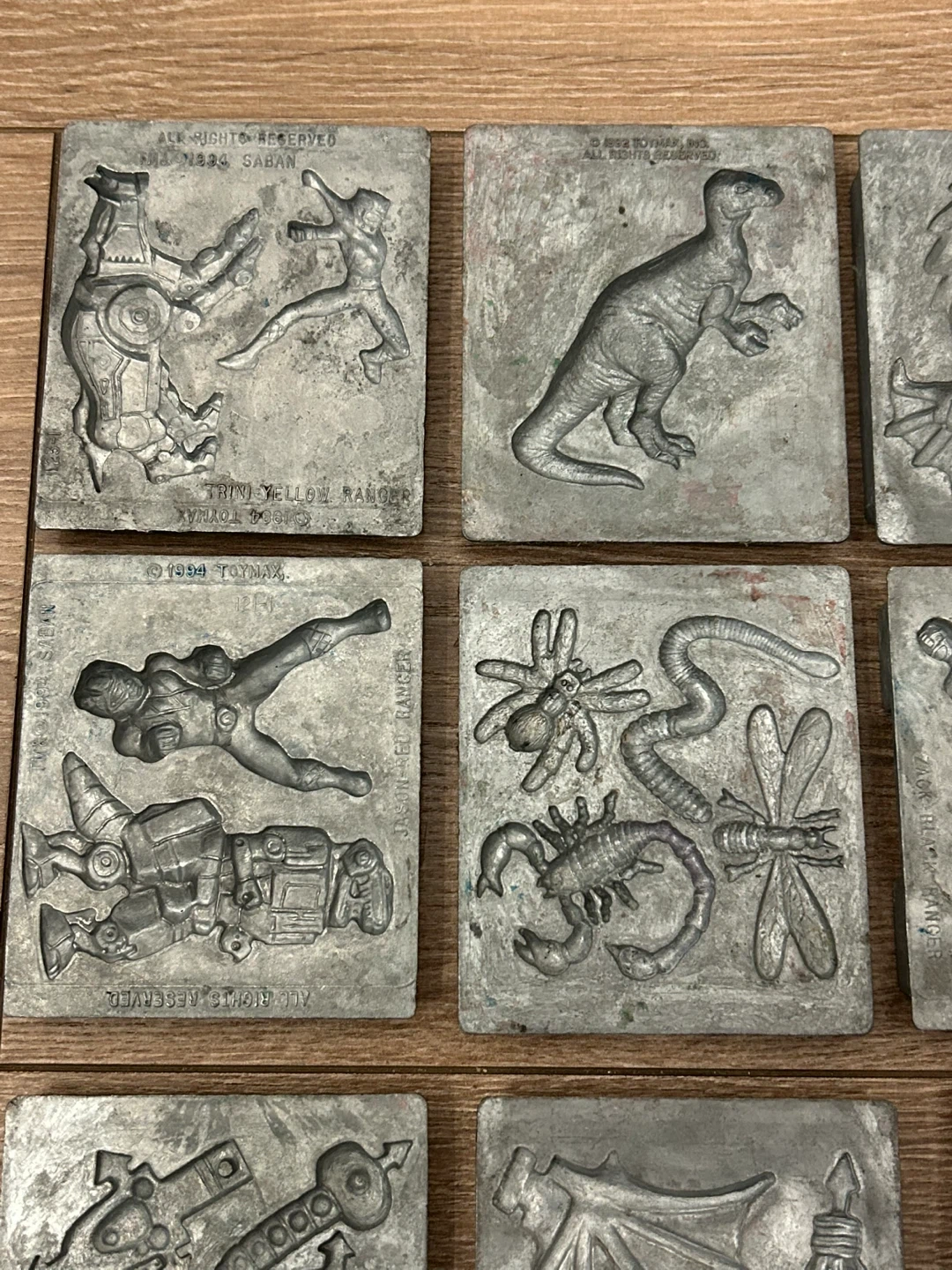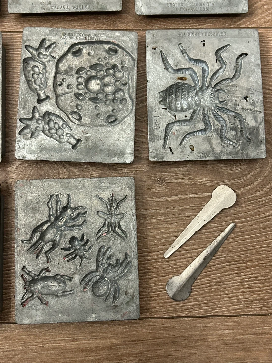 A rare and highly collectible collection of original die-cast metal molds produced by Toymax in the early 1990s. These heavy-duty plates were designed for use with the Metal Molder and Creepy Crawlers workshop sets and feature crisp, deeply engraved designs.