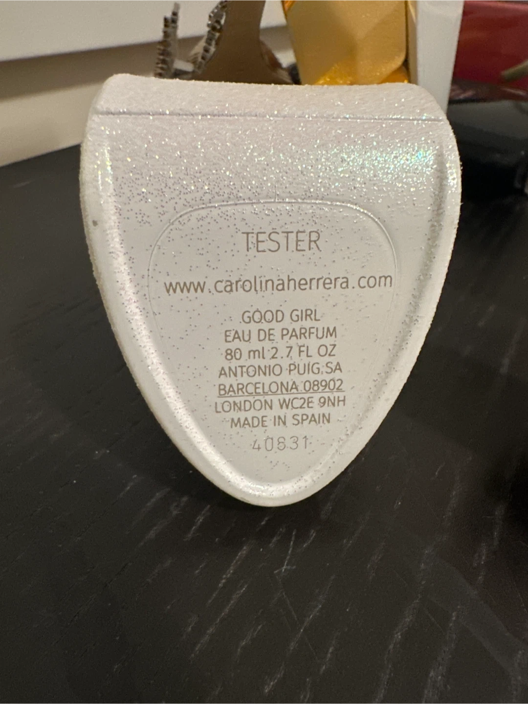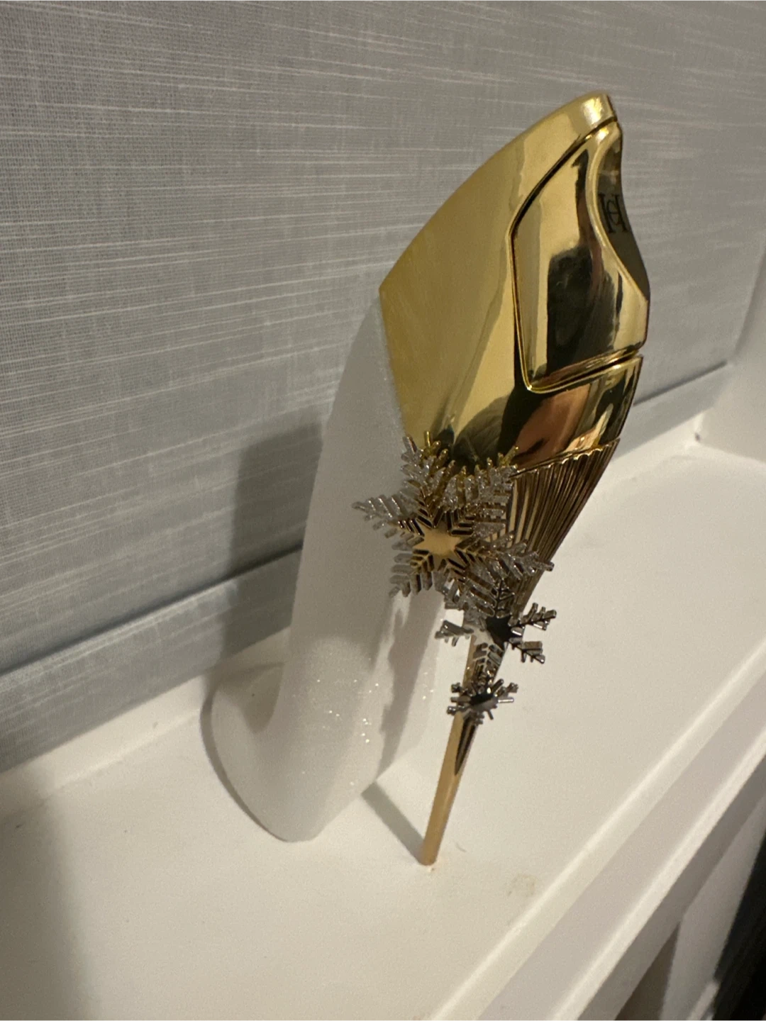 This is a tester bottle of Carolina Herrera Good Girl Eau de Parfum limited edition. It's 80 ml or 2.7 fluid ounces. The bottle is designed as a white glitter stiletto heel with gold accents and snowflake embellishments.