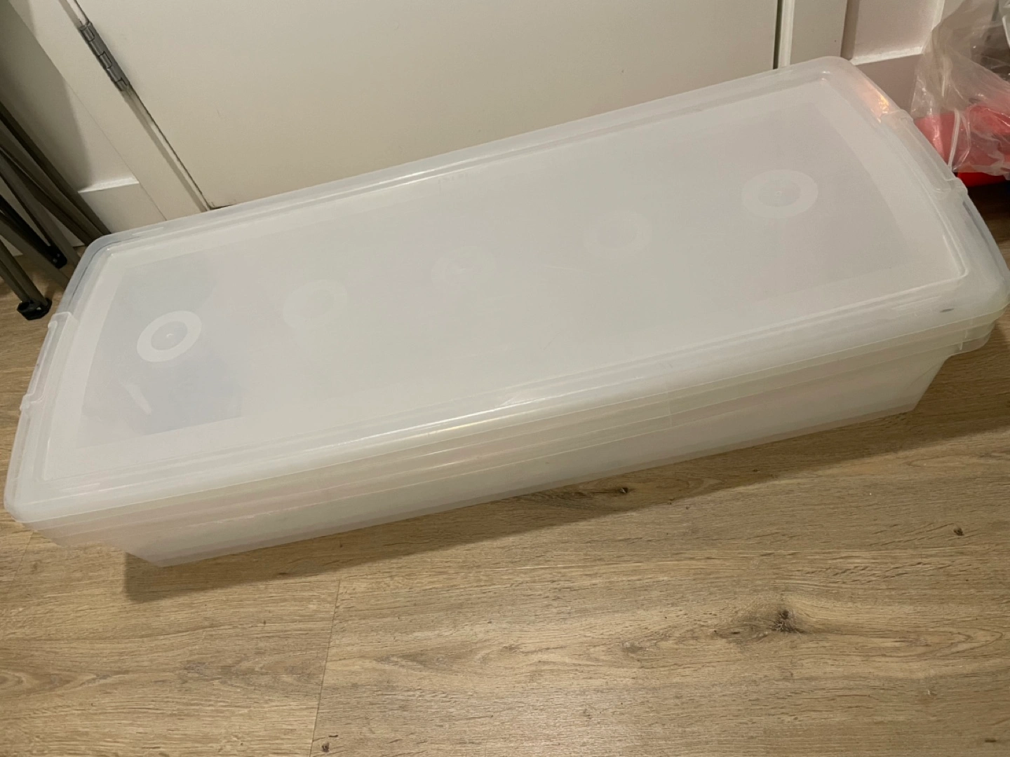 Set of two extra-large clear plastic storage bins. Each bin features a secure-fitting lid. Approximately 36 inches long and 7 inches high. Ideal for storing blankets, seasonal clothing, or other bulky items. Great for organizing closets or garages.