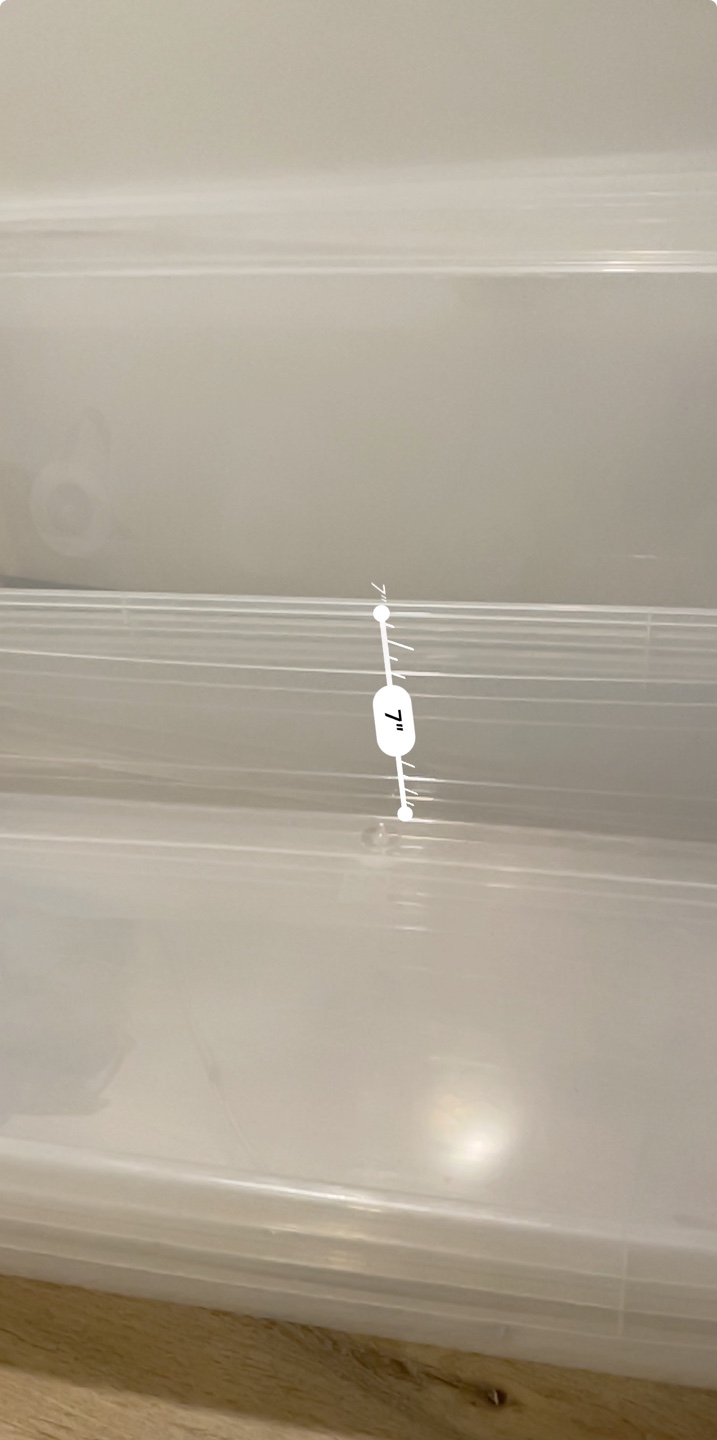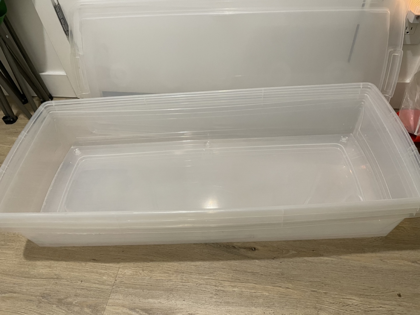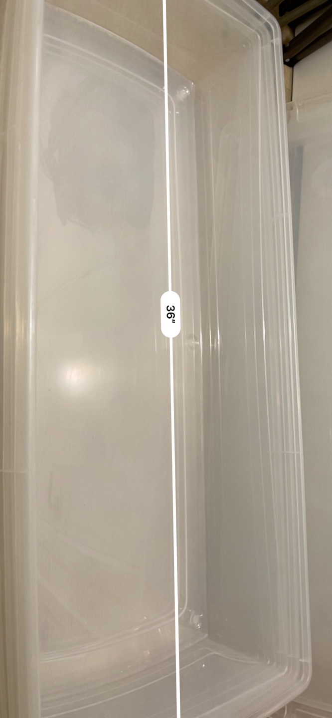 Set of two extra-large clear plastic storage bins. Each bin features a secure-fitting lid. Approximately 36 inches long and 7 inches high. Ideal for storing blankets, seasonal clothing, or other bulky items. Great for organizing closets or garages.