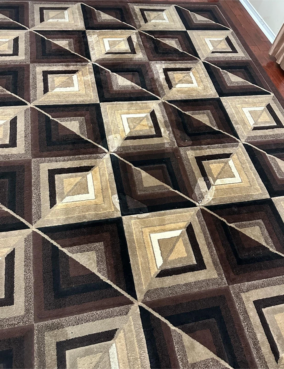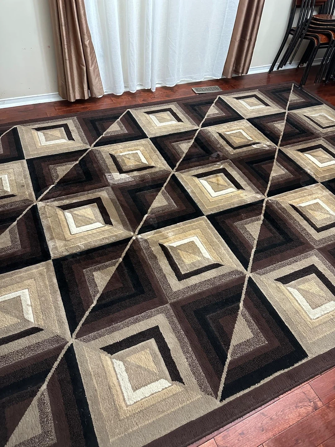 A spacious area rug featuring a geometric pattern in shades of brown, beige, and black. Its dimensions make it suitable for a living room or common area. Adds warmth and style to your home! 60$ or OBO