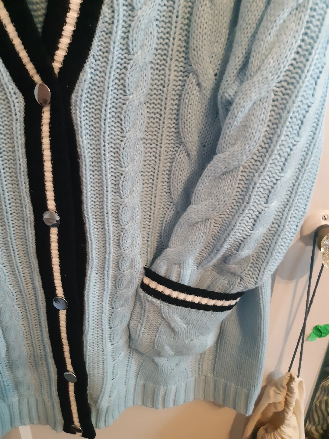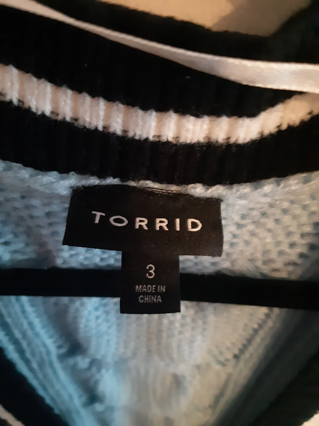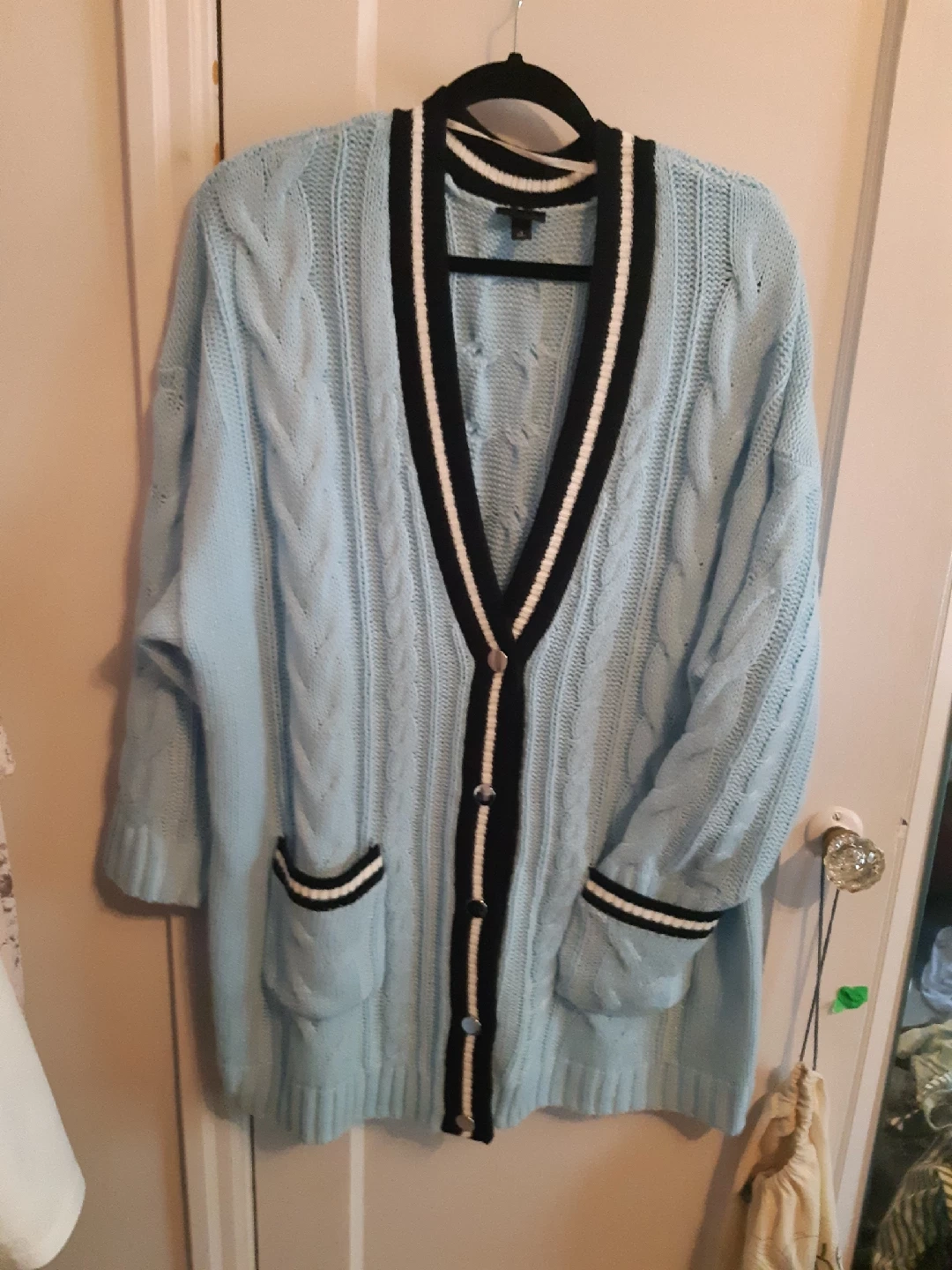 Cute Torrid cardigan in a lovely light blue with black and white trim! It's a size 3 and in great condition. Perfect for layering or wearing on its own