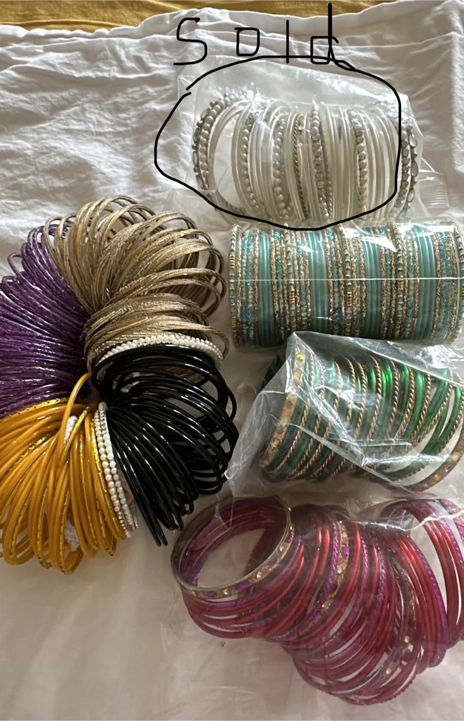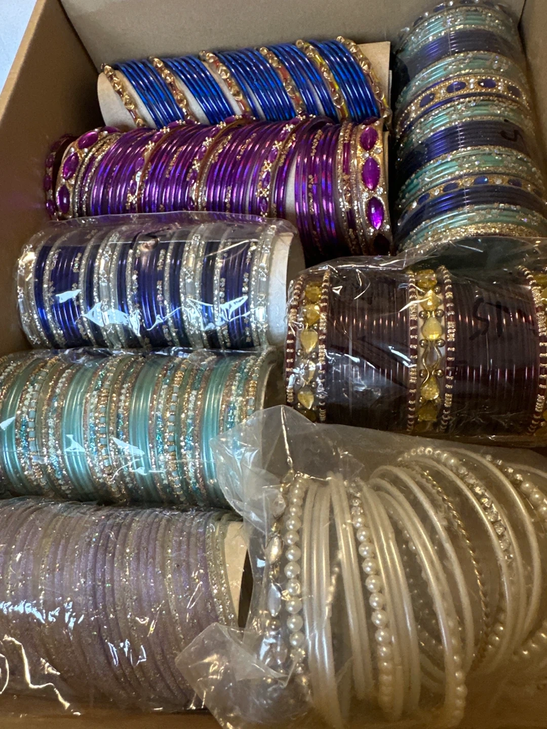 A vibrant collection of bangles in various colours and styles. Includes glass, and beaded designs for diverse fashion needs. These bangles add a festive touch to any outfit. $10 each set