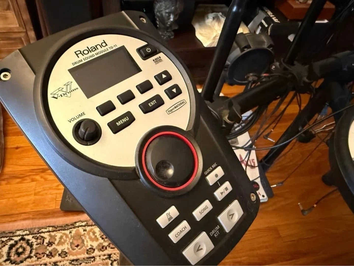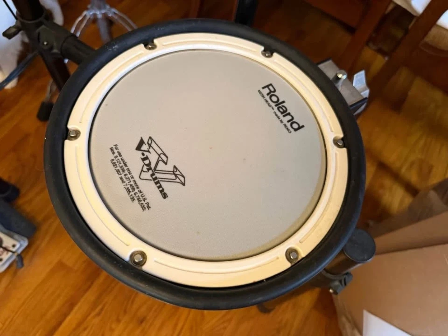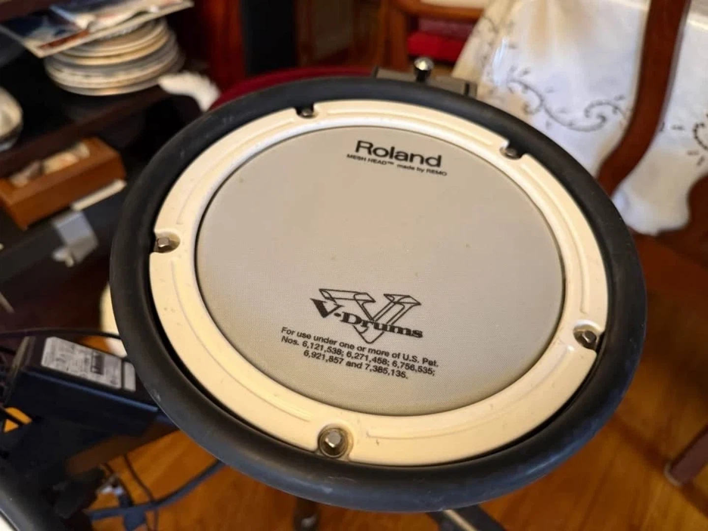 This Roland V-Drums electronic drum set features mesh heads for a realistic feel. It includes multiple pads and cymbal triggers, along with a drum sound module. Excellent for practice and performance! Hasn’t had too much use over the years. Does not come with the hi hat pedal and the pedals in the picture are not included.
